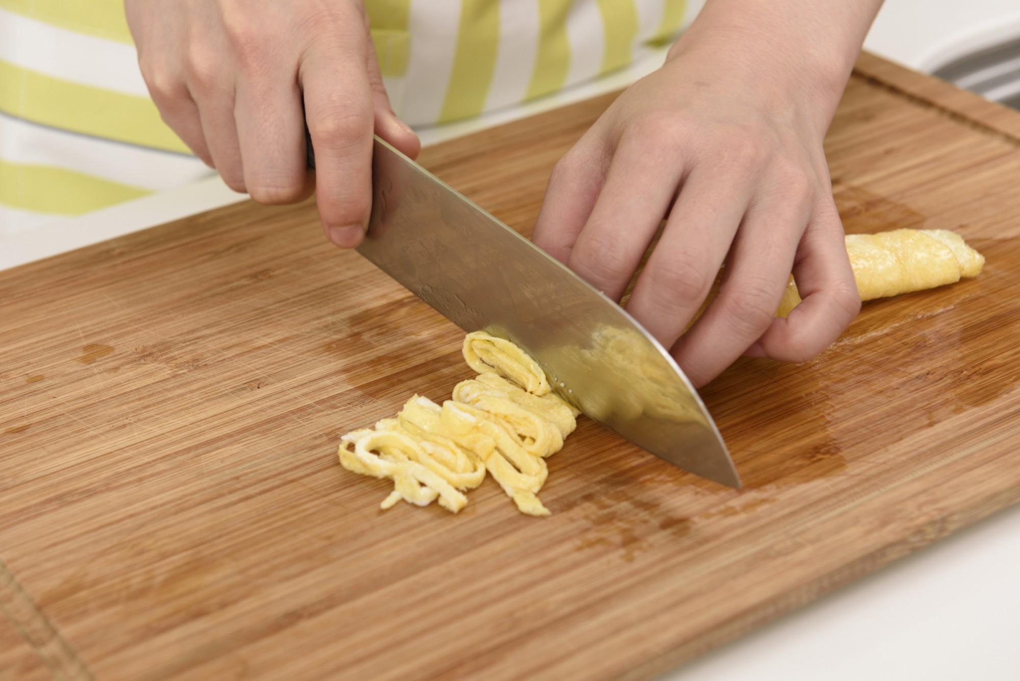 卵を割り溶いたら、油をしき熱したフライパンにサッと回し入れます。焼き上がりに厚みが出ないように大きめのフライパンで円を描くように広げましょう。片面に火が通ったら、一度火を止めて蓋をし少し蒸らすように落ち着かせます。そのあとで卵をひっくり返し予熱で軽く火を通してください。次に、まな板の上で粗熱を取ります。うす焼き卵を丸めて、千切りにしていきましょう。