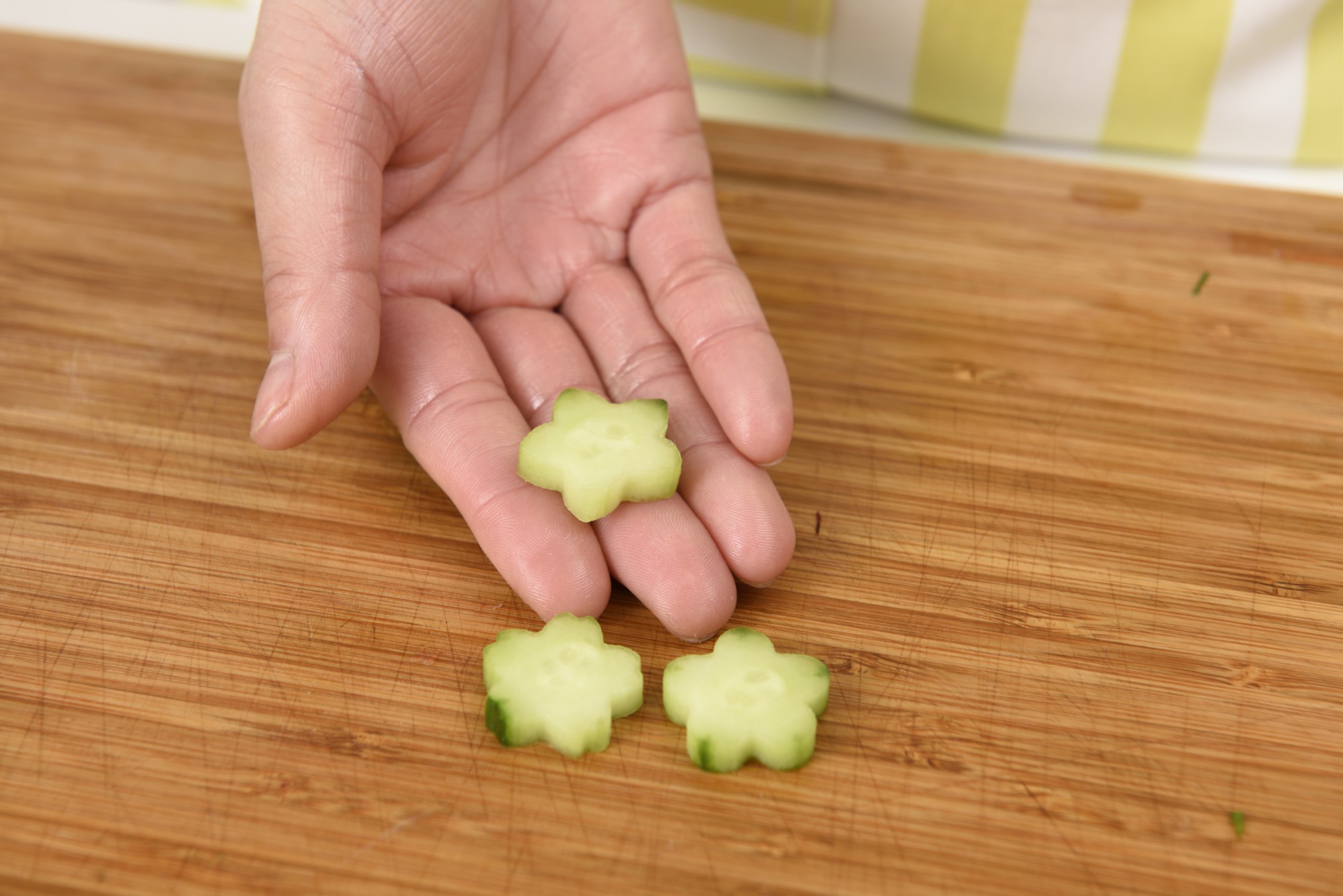 きゅうりは、型抜きを使うと子どもができる作業も増えますし、可愛く仕上がります!