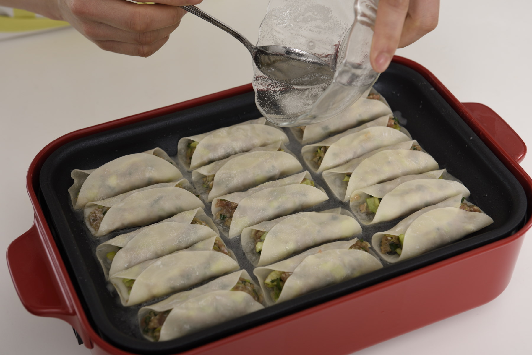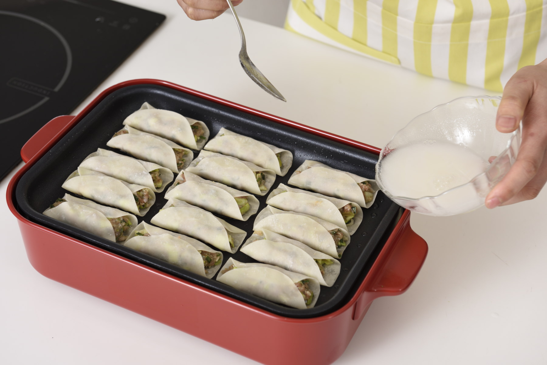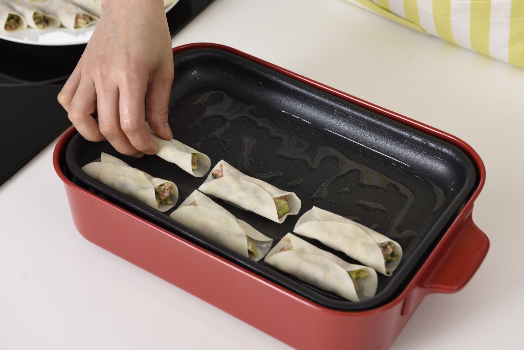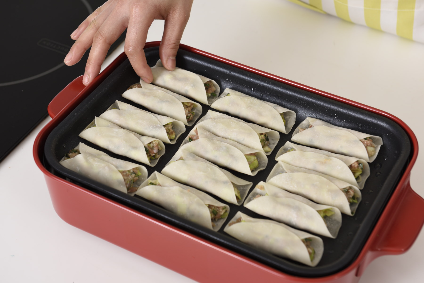 まだ餃子の皮を巻くのが難しいお子さんでもこれなら簡単ですね。ホットプレートで焼くのも楽しいです。