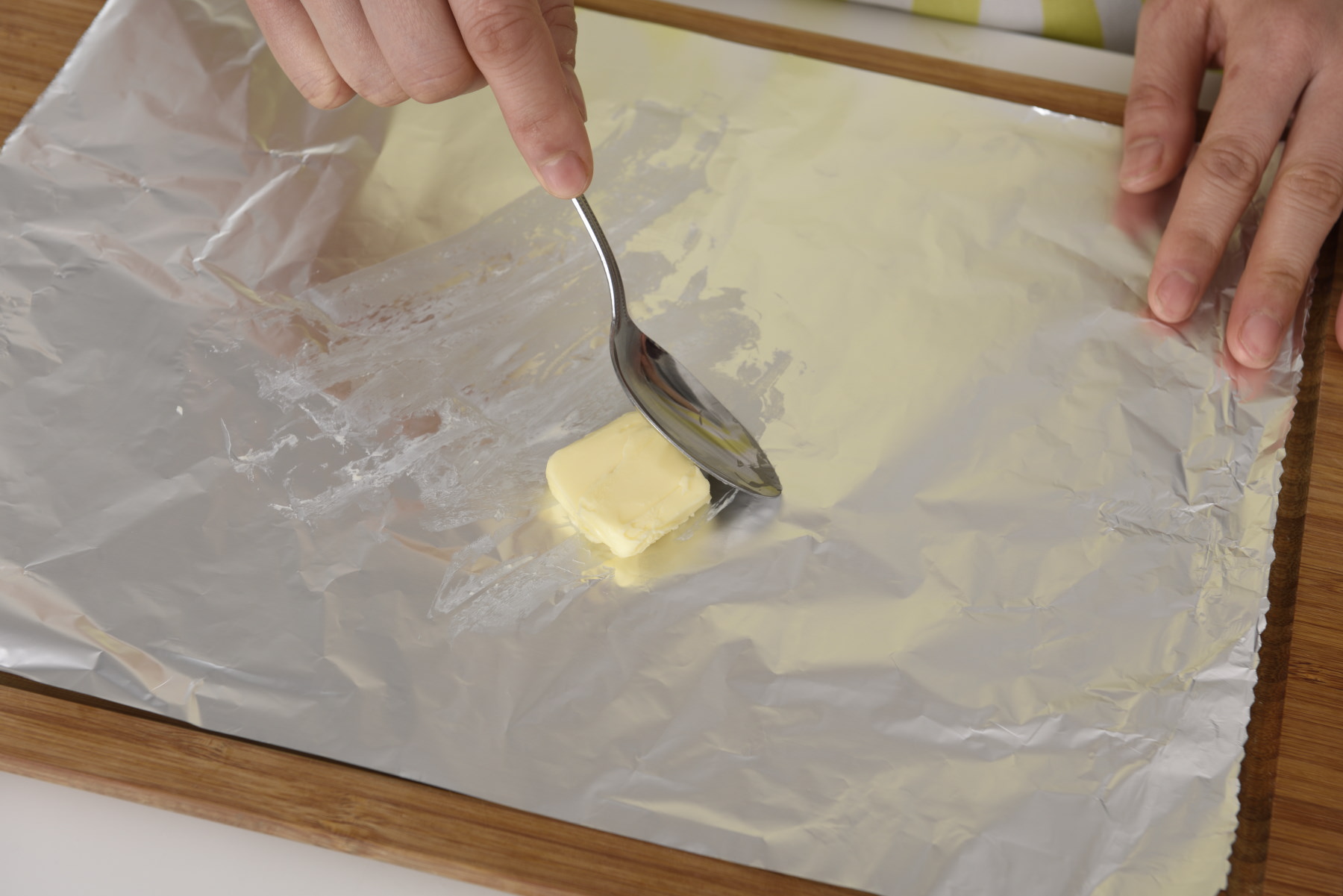 アルミホイルにバターを塗ります。スプーンで塗るとやりやすいですよ!