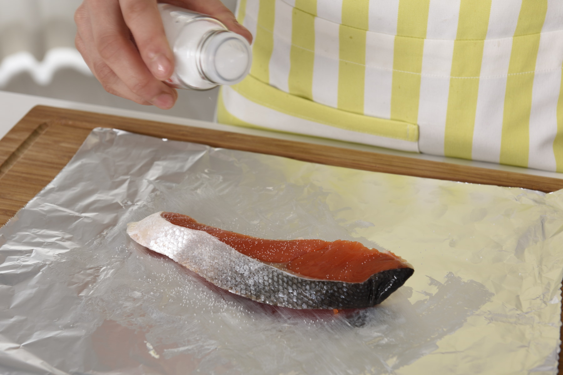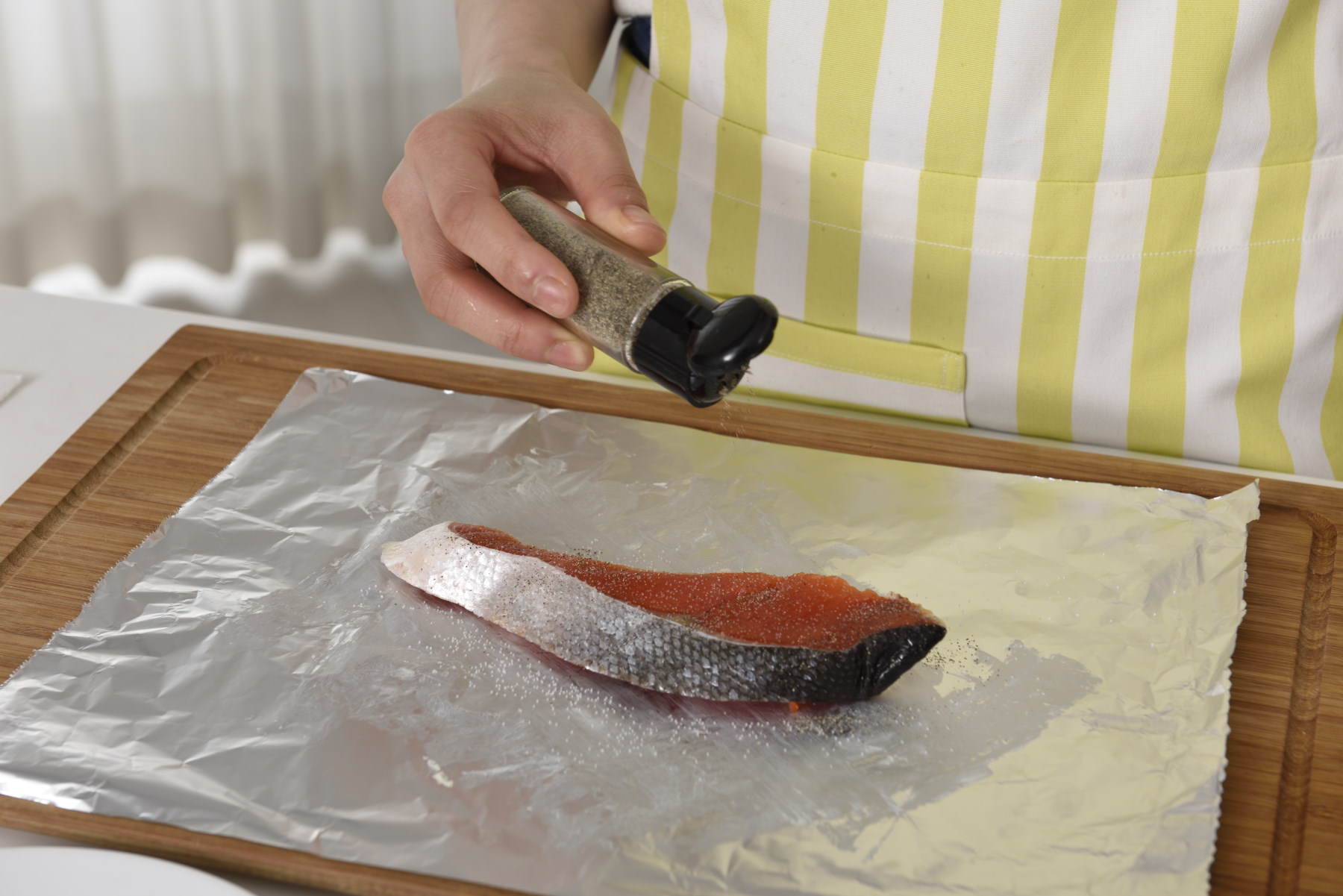 バターを塗ったアルミホイルの上に鮭の切り身を置いて塩コショウをふります。