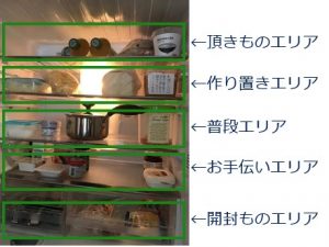 食材を全部出した後、戻すときに写真のように、モノの住所を決めると探しやすくなります。