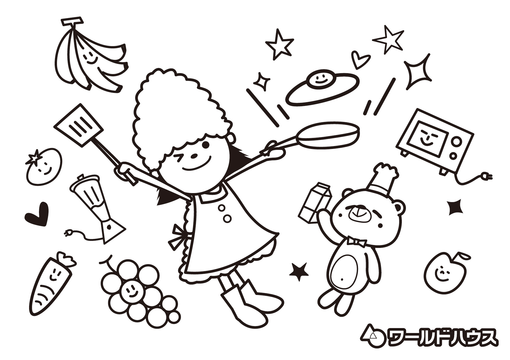いろいろな調理器具や食材が並んでいるひのきちゃんのキッチンを、好きな色で塗ってみましょう!