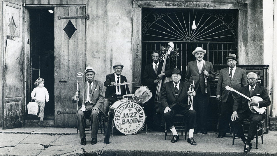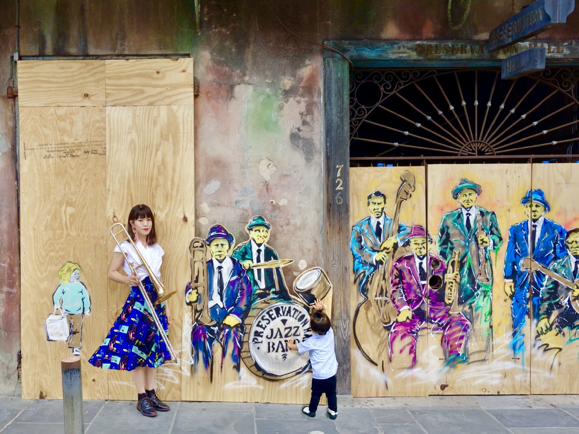 ※老舗のライブハウス「プリザベーション・ホール」の前にて。昔の写真を再現した、素敵なペインティングが施されています!