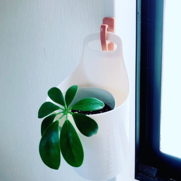 専用のプラントハンガーでなくてもOK。例えば、引っかけ穴が付いたハンディモップ用収納ケース。鉢を入れて吊り下げたら、立派なプラントハンガーです。