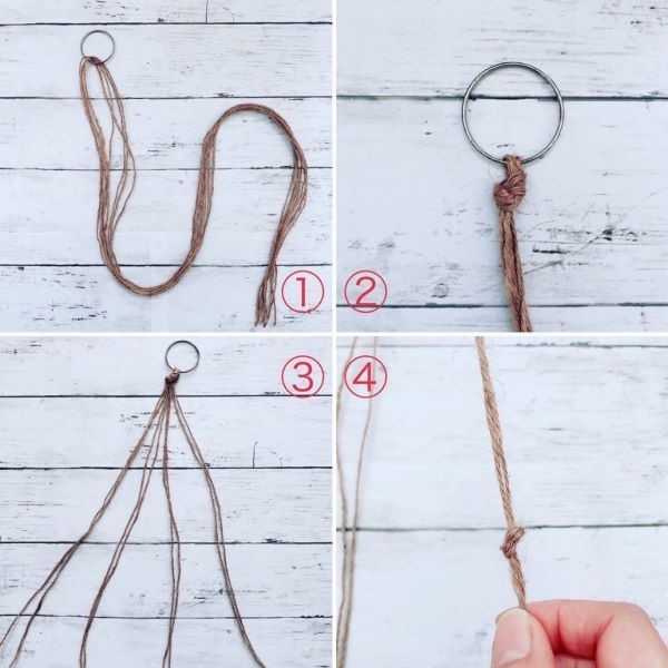 ① ヒモを4本用意する。束にしてリングに通し、半分におる。