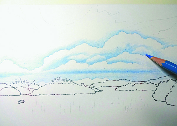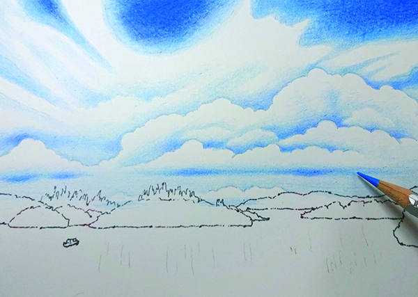 水色で、雲のまわりから塗っていきましょう。外側に向かって輪郭をぼかしながら塗ると、空と雲が自然に調和します。白い雲は、紙の白地で表現するのでそのまま塗り残します。白色の色鉛筆は使いません。このテクニックは雪山などを描くときにも使えるので、覚えておくと便利です。