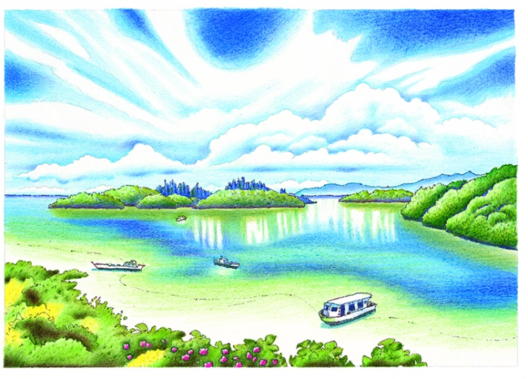 沖縄県・石垣島川平湾の風景です。お手本を見ながら塗ってみます。