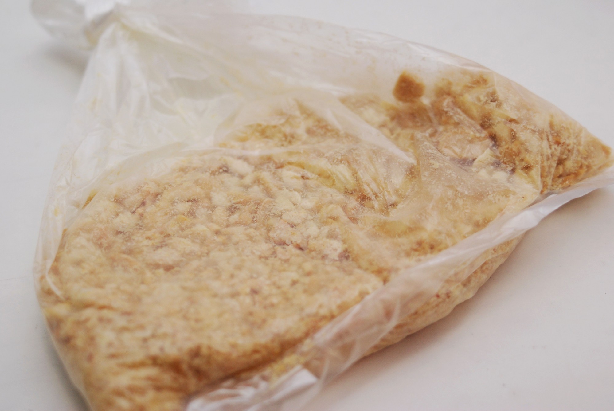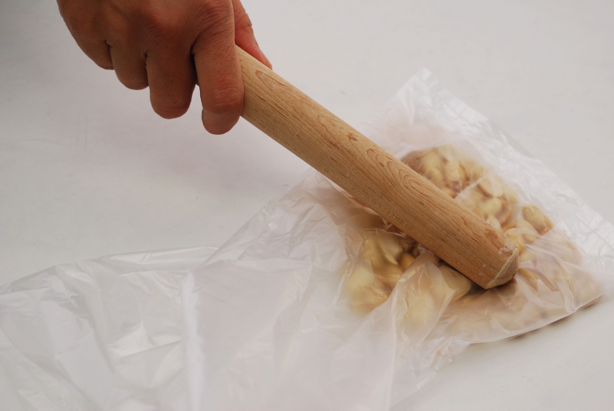 ピーナッツをビニール袋などに入れ、綿棒で叩いて細かくクラッシュします。綿棒の先端で強く叩くと袋が破けてしまうので、綿棒の腹で軽く叩くのがポイント。心配でしたら袋を二重にしてくださいね。