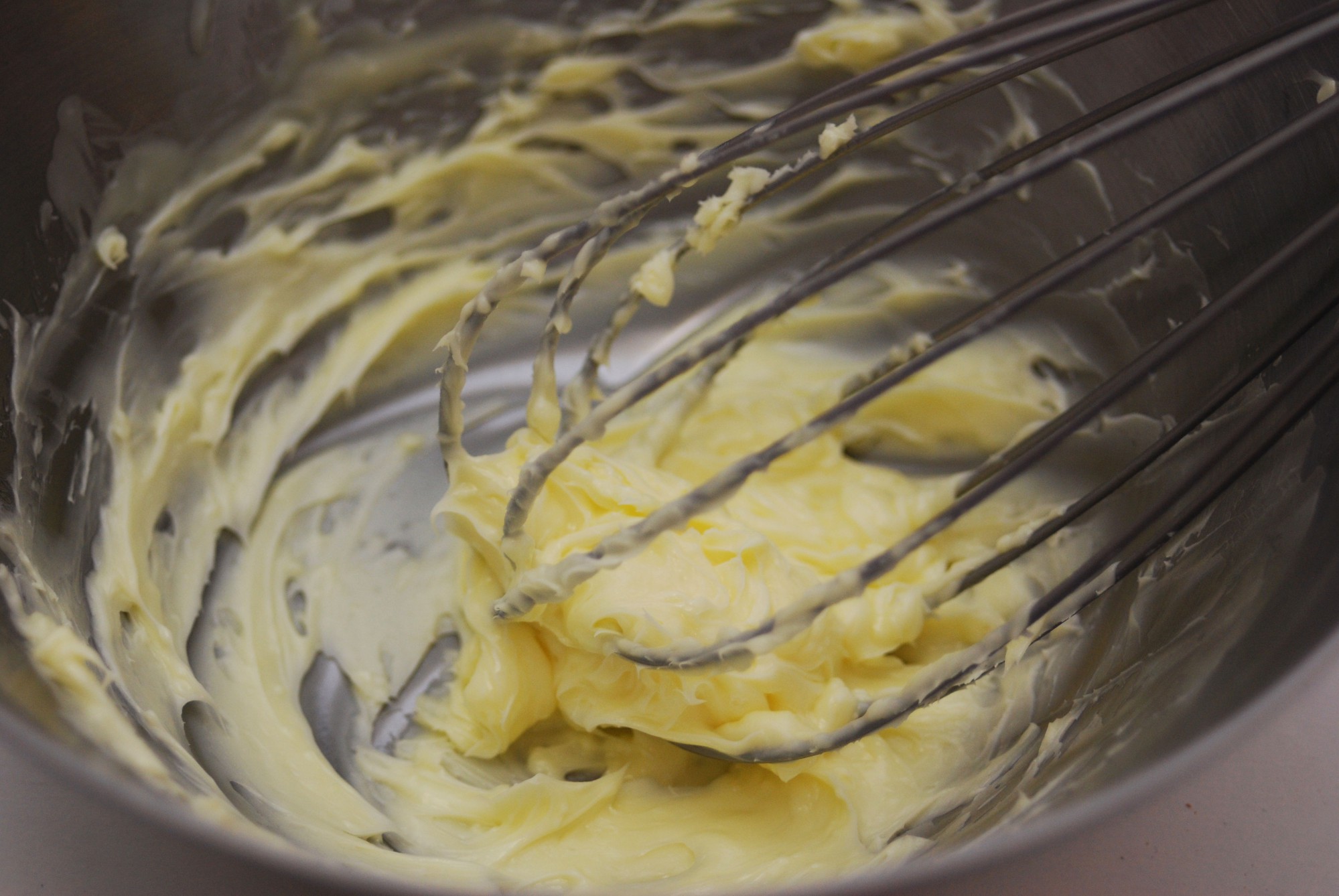 常温に戻したバターをボウルに入れ、泡立て器で滑らかなクリーム状になるまでよく混ぜます。クリーム状になったら砂糖、卵を加えてさらによく混ぜます。
