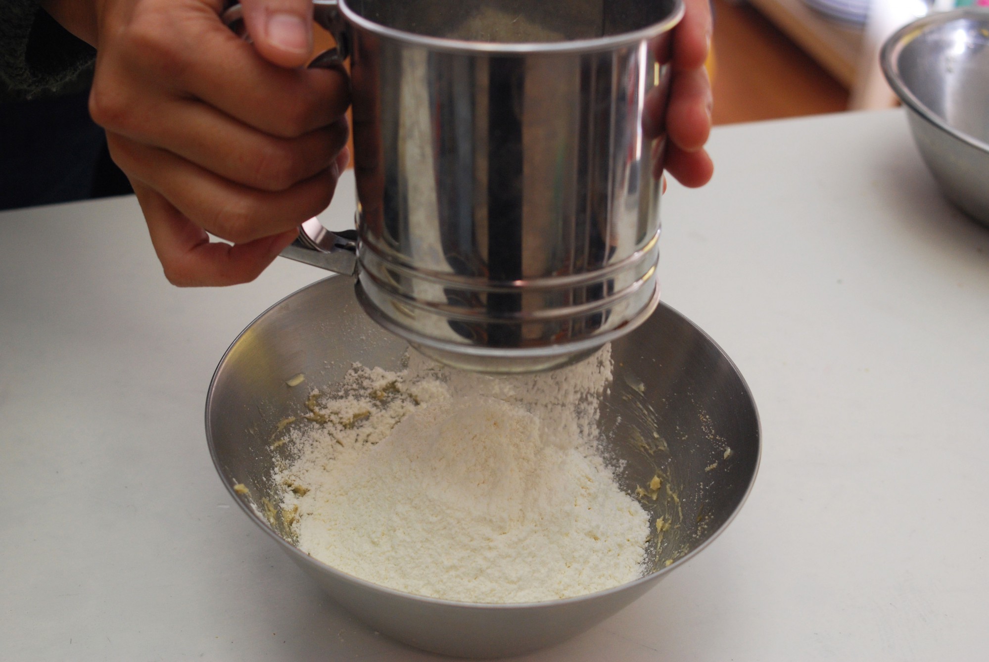薄力粉を振るいながら加え、スパチュラなどで切るようにして混ぜます。「練るのではなく切るようにして」混ぜるのがポイントです。