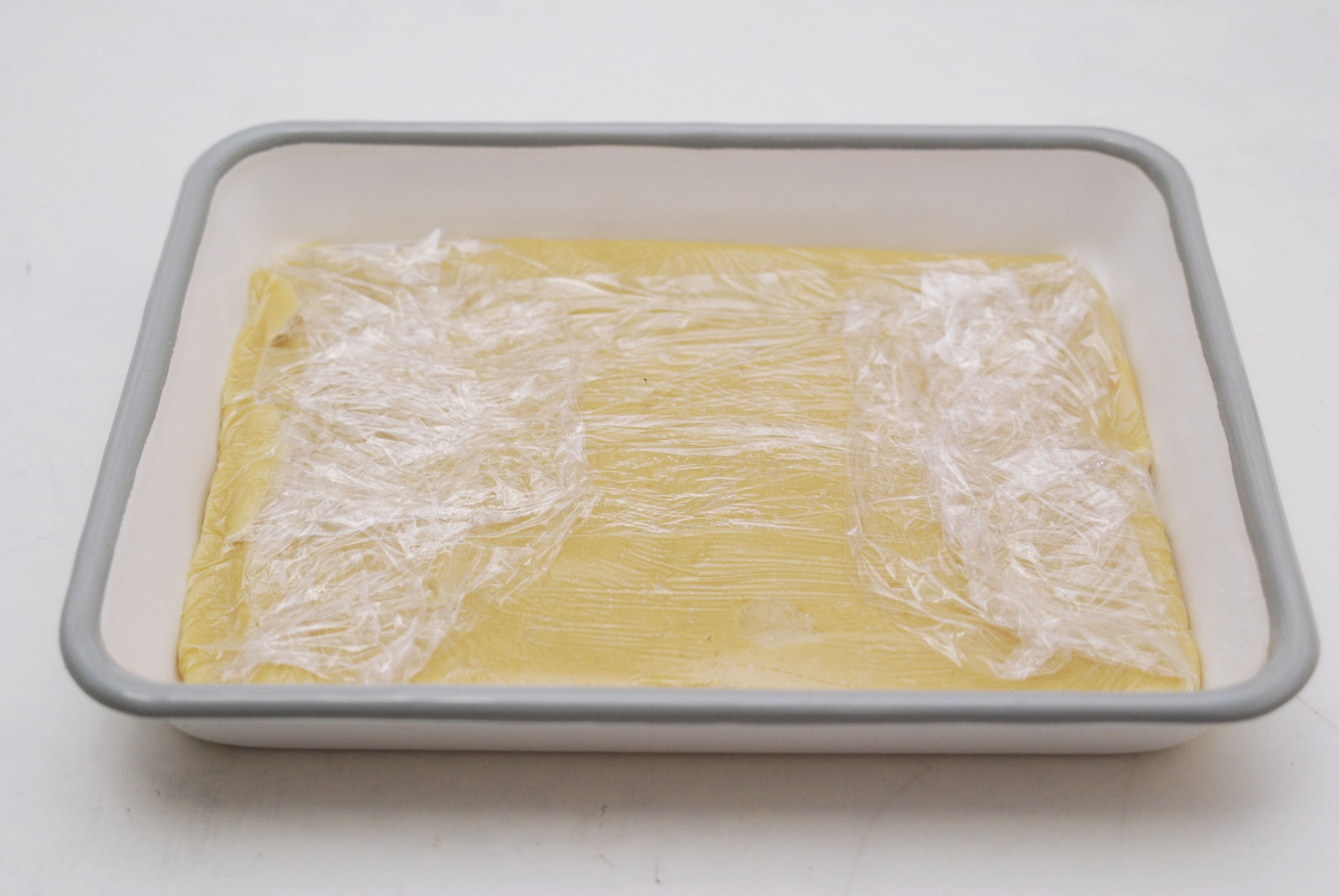 生地をラップで包み、型に入れて成型します。厚さはお好みですが、大体3~7mm程度が目安です。成型したら冷蔵庫に入れて1時間ほど休ませましょう。
