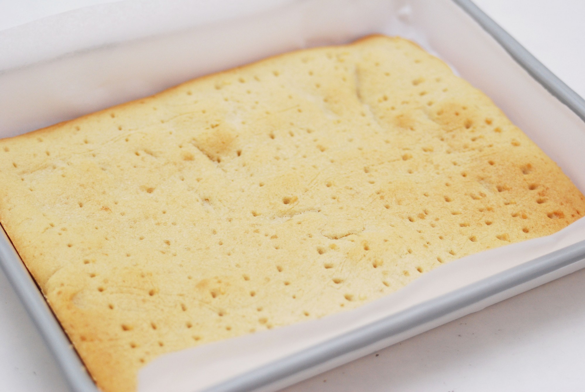焼き終わって荒熱がとれたら、お好きなサイズに切り分けましょう。ラップをせず冷蔵庫で1時間ほど冷やすと、サクッとした食感になりますよ。