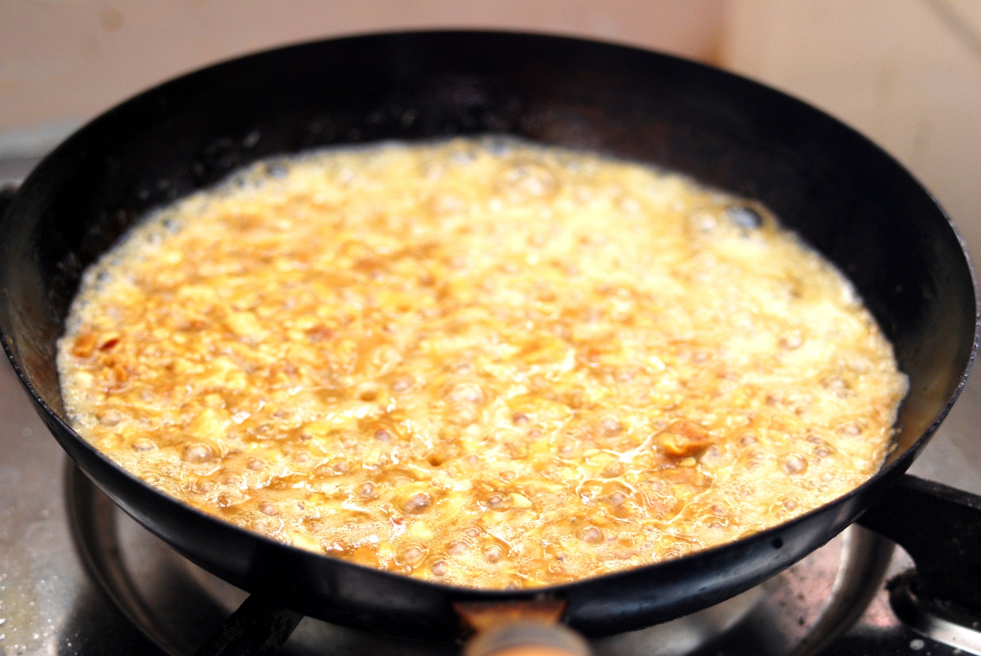 生地を焼いている間にソースを作ります。ピーナッツ以外のソース用材料をフライパンに入れて加熱します。全体が溶けてよく混ざったらローストしたクラッシュドナッツを加えてよく和え、とろみがつくまで煮詰めます。