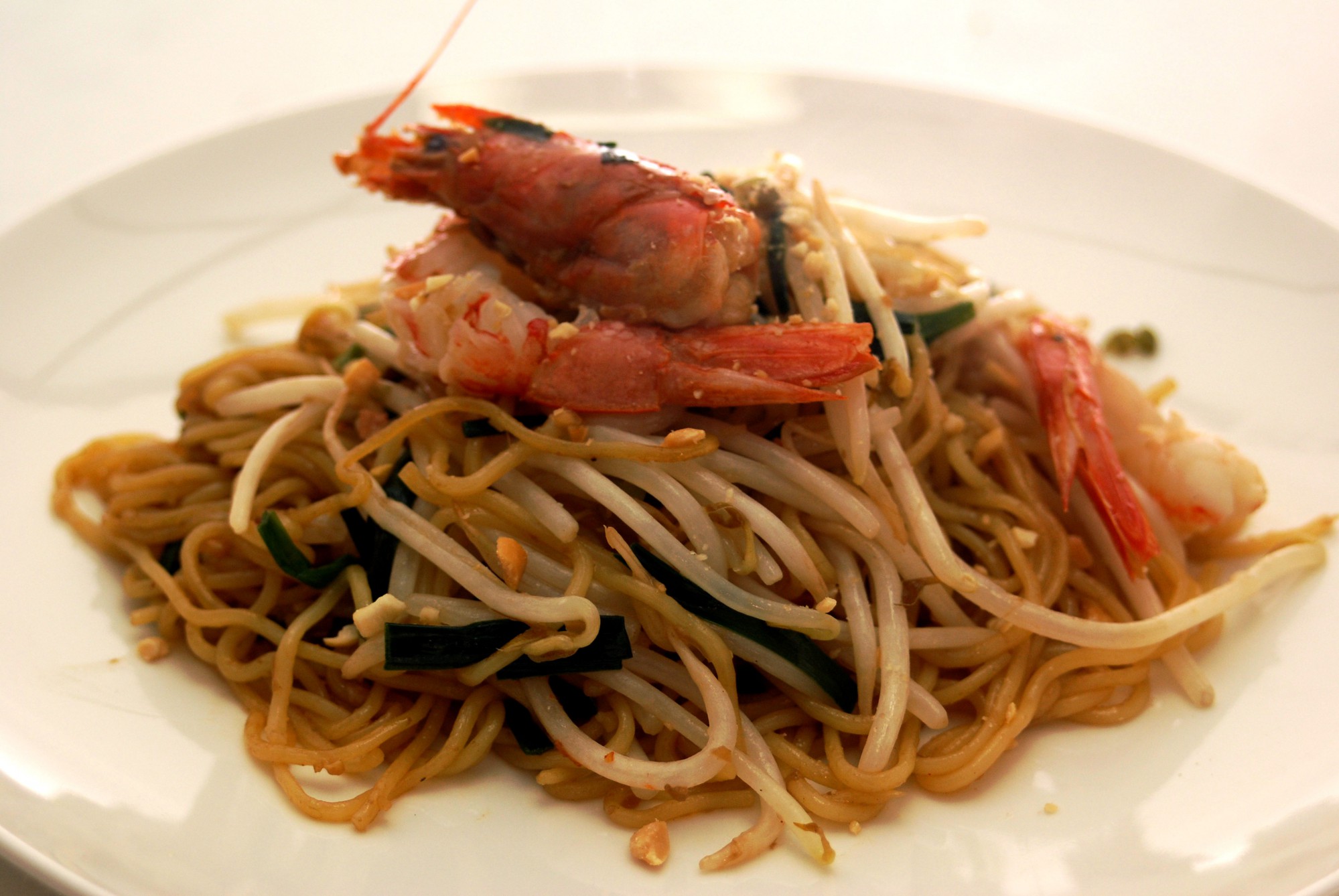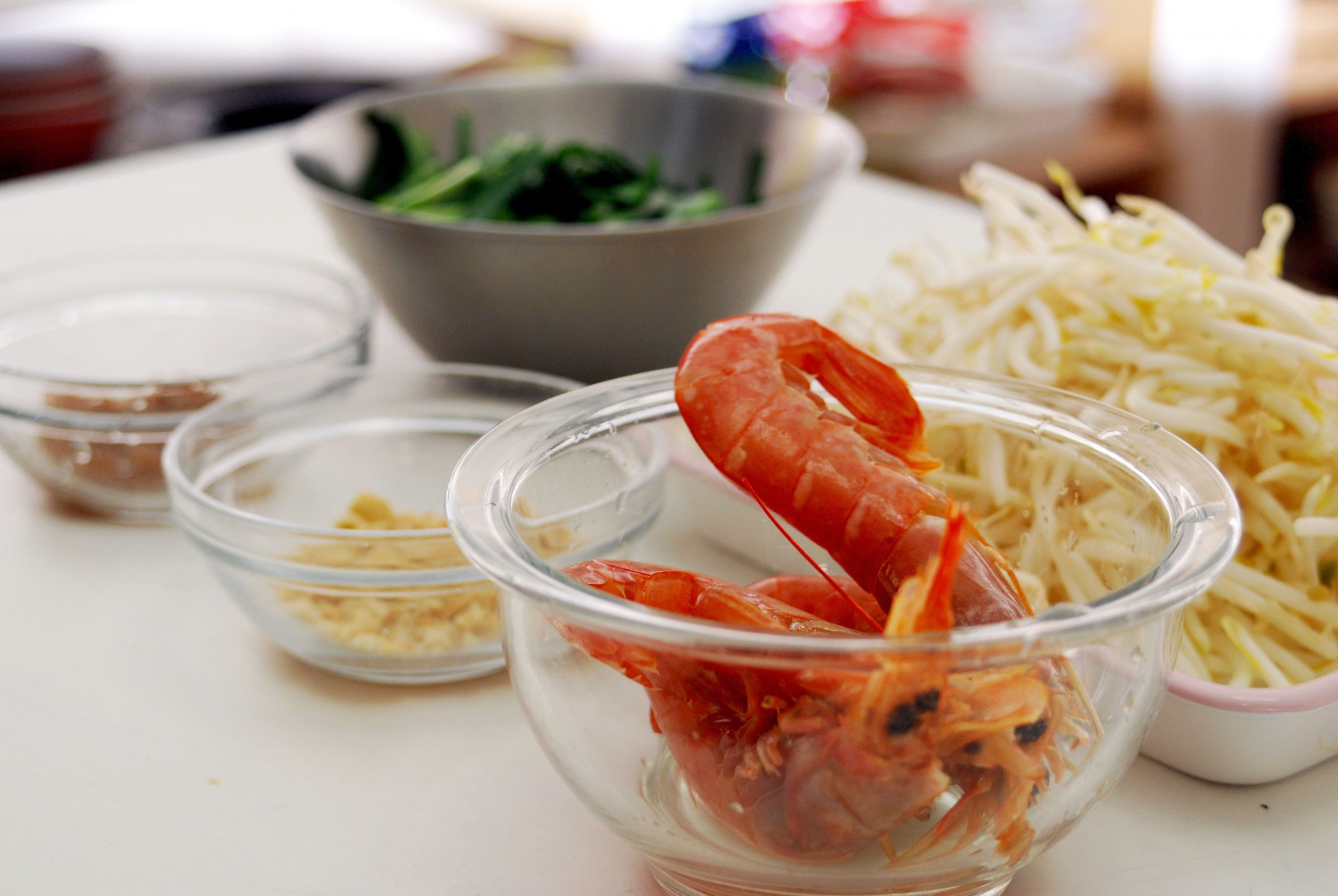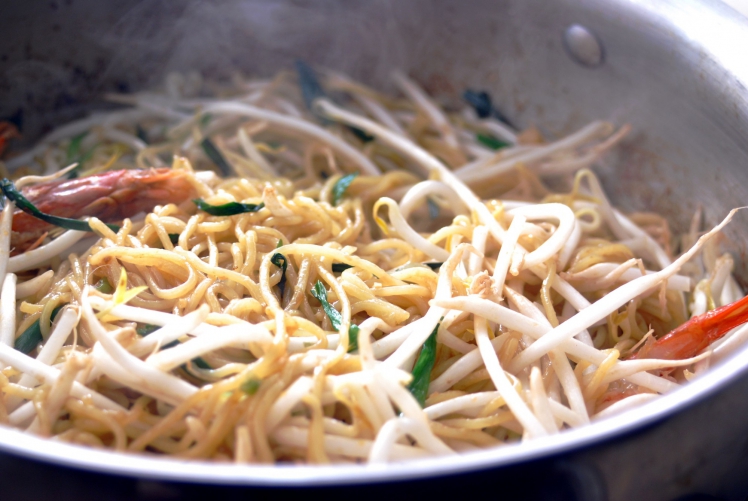 ニラを加えてざっと火が通ったら麺を加えます。麺の炒め方は、商品パッケージの説明通りに。さらに海老、もやし、包丁で叩いた梅干し、ナンプラー、オイスターソースを加えて全体をよく和えながら炒めます。ポイントは、海老の身ともやしを加熱し過ぎないこと!海老を加熱し過ぎると身が縮まり食感が損なわれ、もやしもせっかくのシャキッとした食感が失われてしまいます。