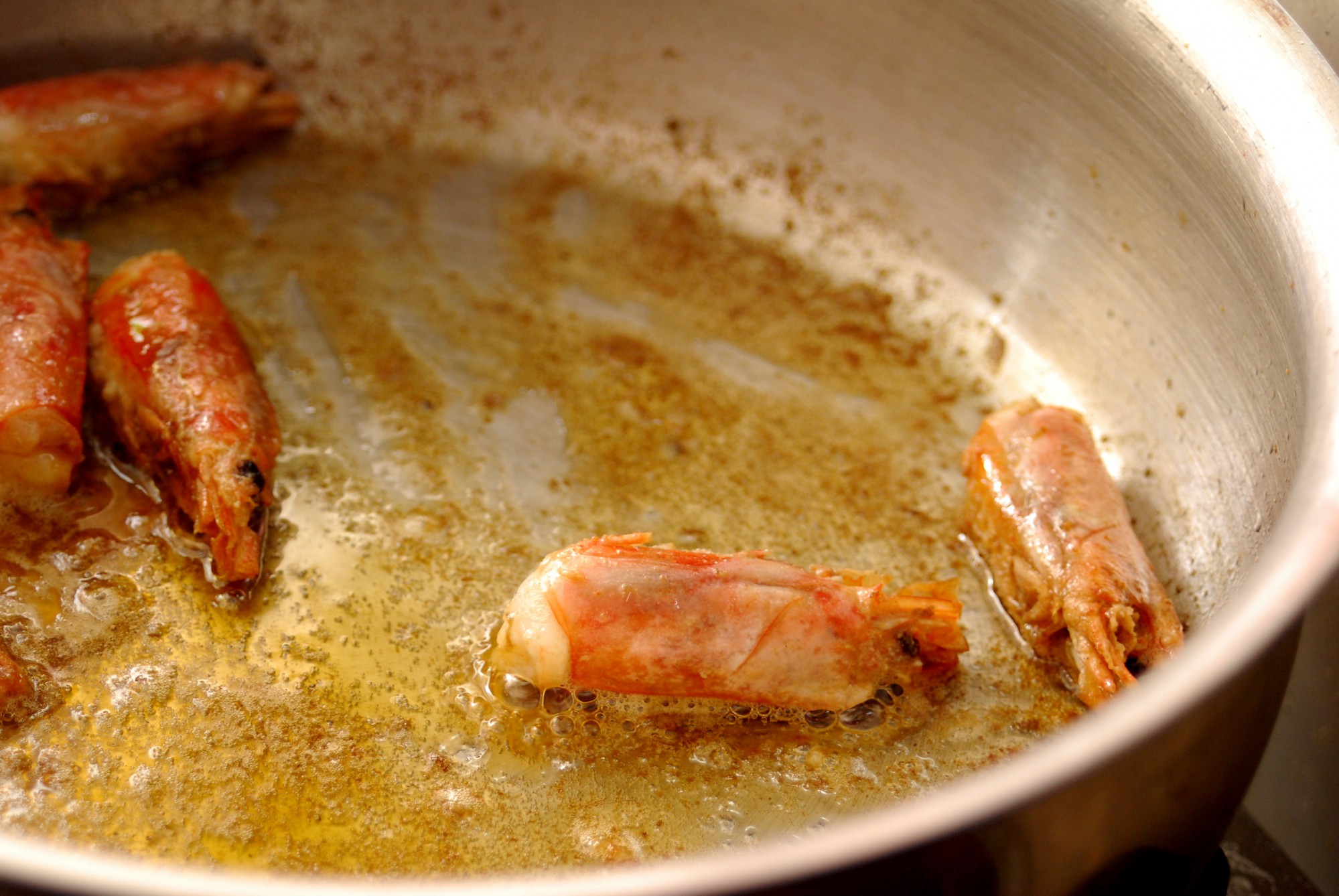 ② 海老の頭を炒める