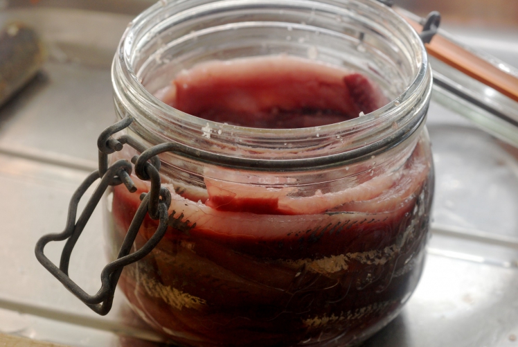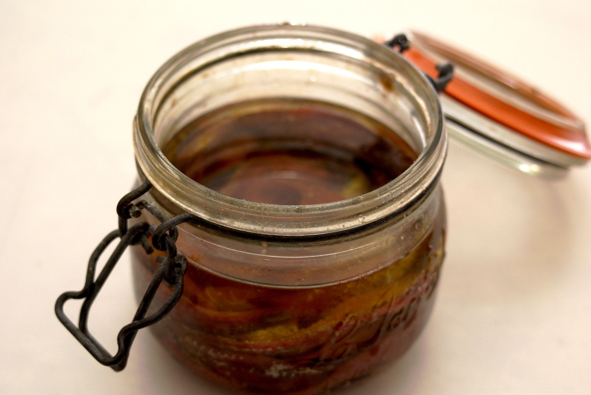 フィレをオイル漬けにした様子です。もうアンチョビとして使えますが、このまま1~3ヶ月ほど寝かせておくと、さらにおいしく召し上がれます。常温で保存しても冷蔵保存してもかまいませんが、冷蔵保存の場合、オリーブオイルが固まってしまう場合があります。その場合はアンチョビを使用する30分~1時間前にビンを冷蔵庫から出し、オイルを常温に戻しておきましょう。