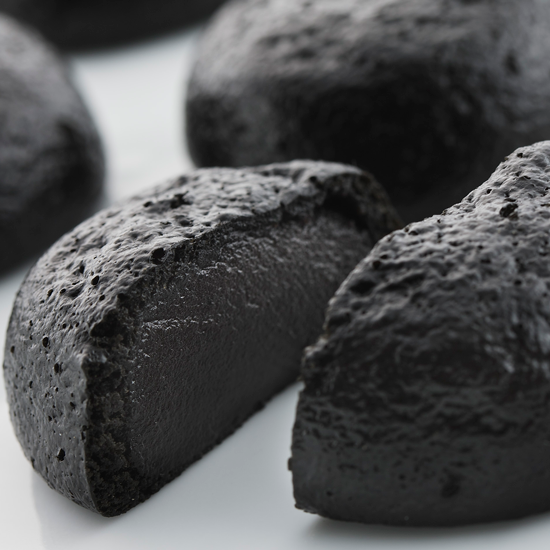 黒色の正体は黒糖。つやつやの皮にも餡にも黒糖が使われており、一口食べると黒糖の風味が広がります。もっちりとした食感で持ってみると見た目以上の重量感。中身はこしあんで、とても滑らかな口当たりです。