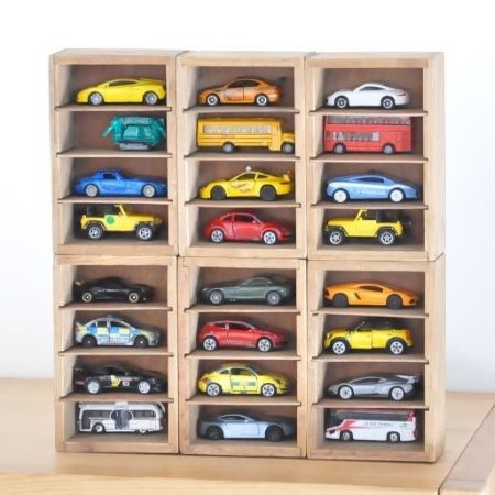 上の写真は、100均で購入した木製の棚を、木工用ボンドでつなぎ合わせたコレクションケースです。色とりどりのミニカーがズラッと並ぶ様子はなかなか素敵です!