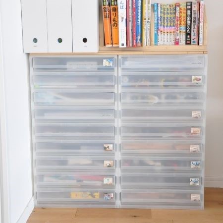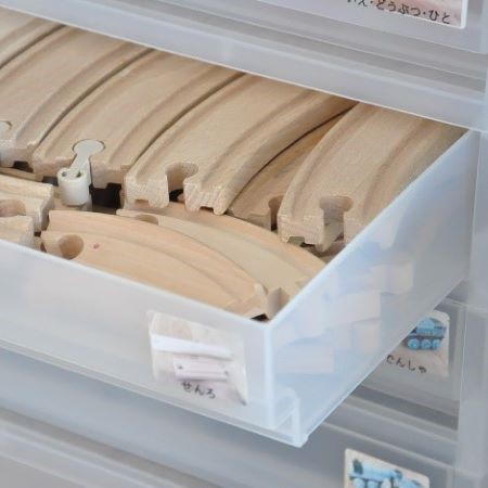 折り紙やお人形、電車、レールなどは、薄型の引き出し式収納ケースを使うのがオススメ。こちらは、A4横サイズ・薄型の引き出しを重ねた収納ケースです。