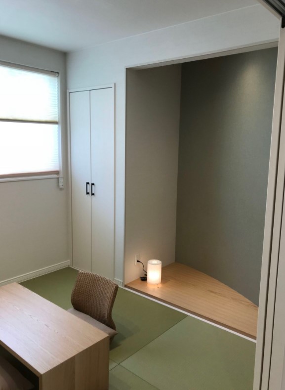 押し入れの横は、壁の曲線が美しい床の間スペース。フチなしの和紙畳と相まって、スッキリとモダンな印象です。