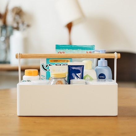 バタバタする朝はリビングで、ゆっくりしたい夜は寝室で…。そんなふうに、日々のスキンケアを行うのは洗面所に限らないという方におすすめなのが、持ち手付きのツールボックスです。