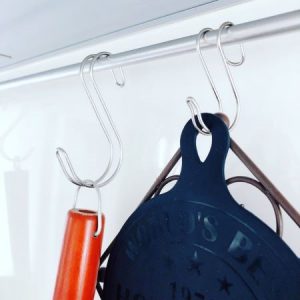 引っかける収納でイライラしがちなのがフックの揺れ。フックの先があっちに向いたりこっちに揺れたりすると、鍋やフライパンをかけるのにも手間取ります。