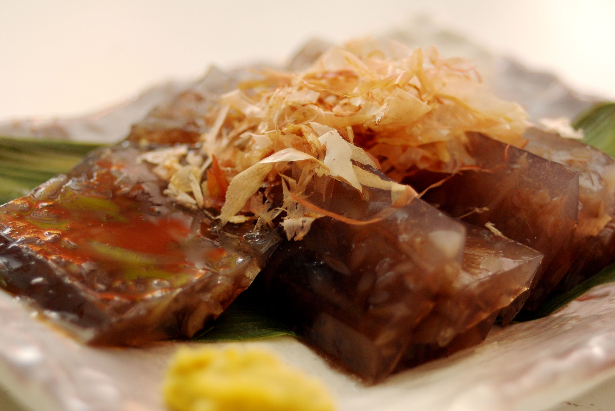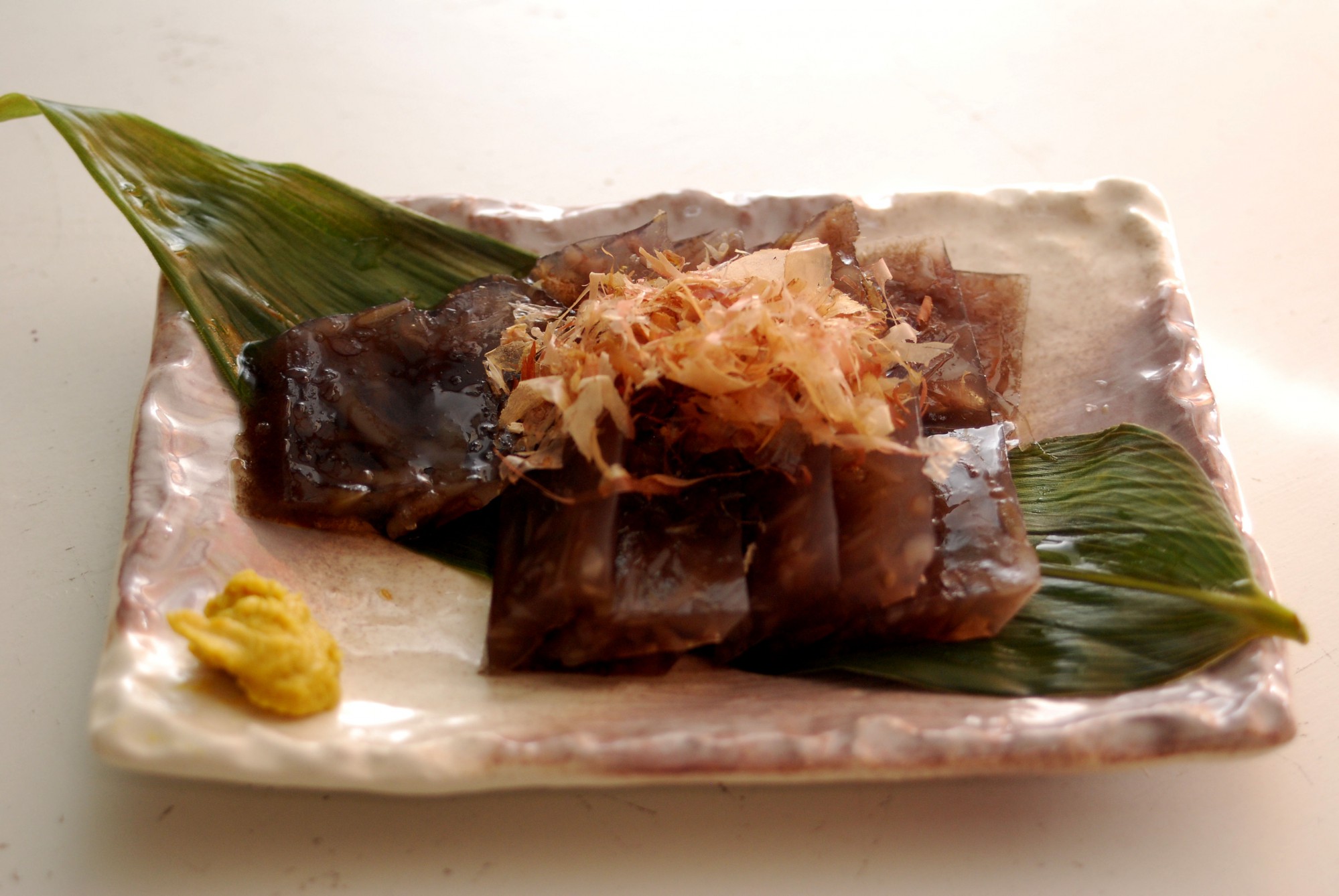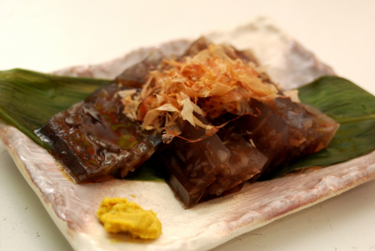冷えて固まったら、長又の海藻こんにゃくの完成です。お好みサイズに切って、からしを添えたりしょうゆにつけたりしてお召し上がりください。鰹節の削り節や青のりなどをかけて食べると美味です。