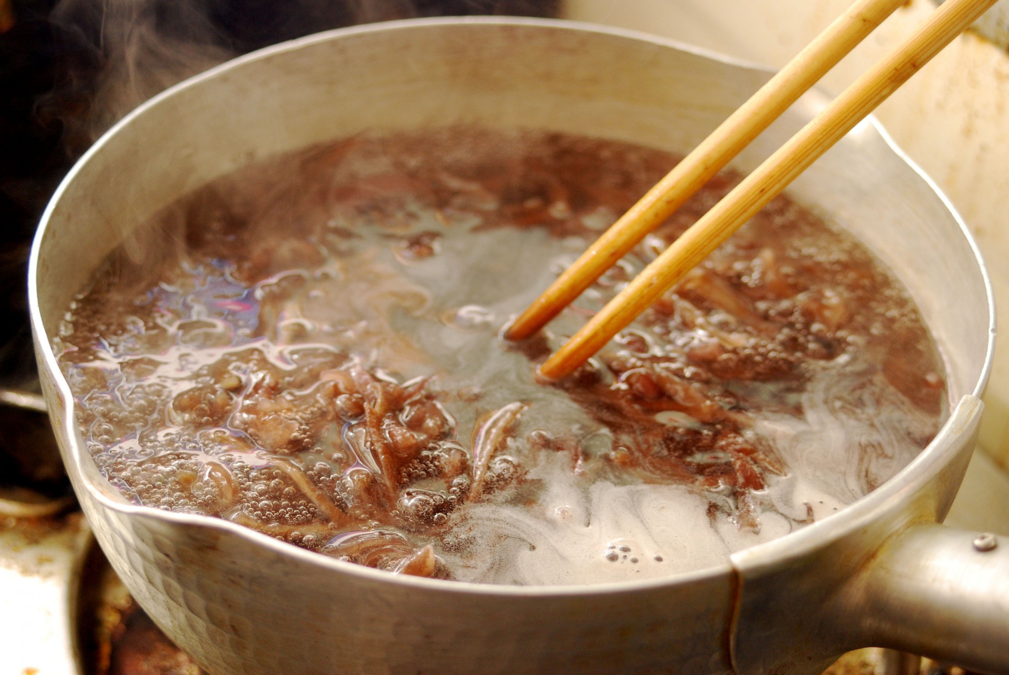 鍋に湯を沸かし、沸騰したらカットした長又を入れて15分ほど煮込みます。たまに、はしでかき混ぜましょう。
