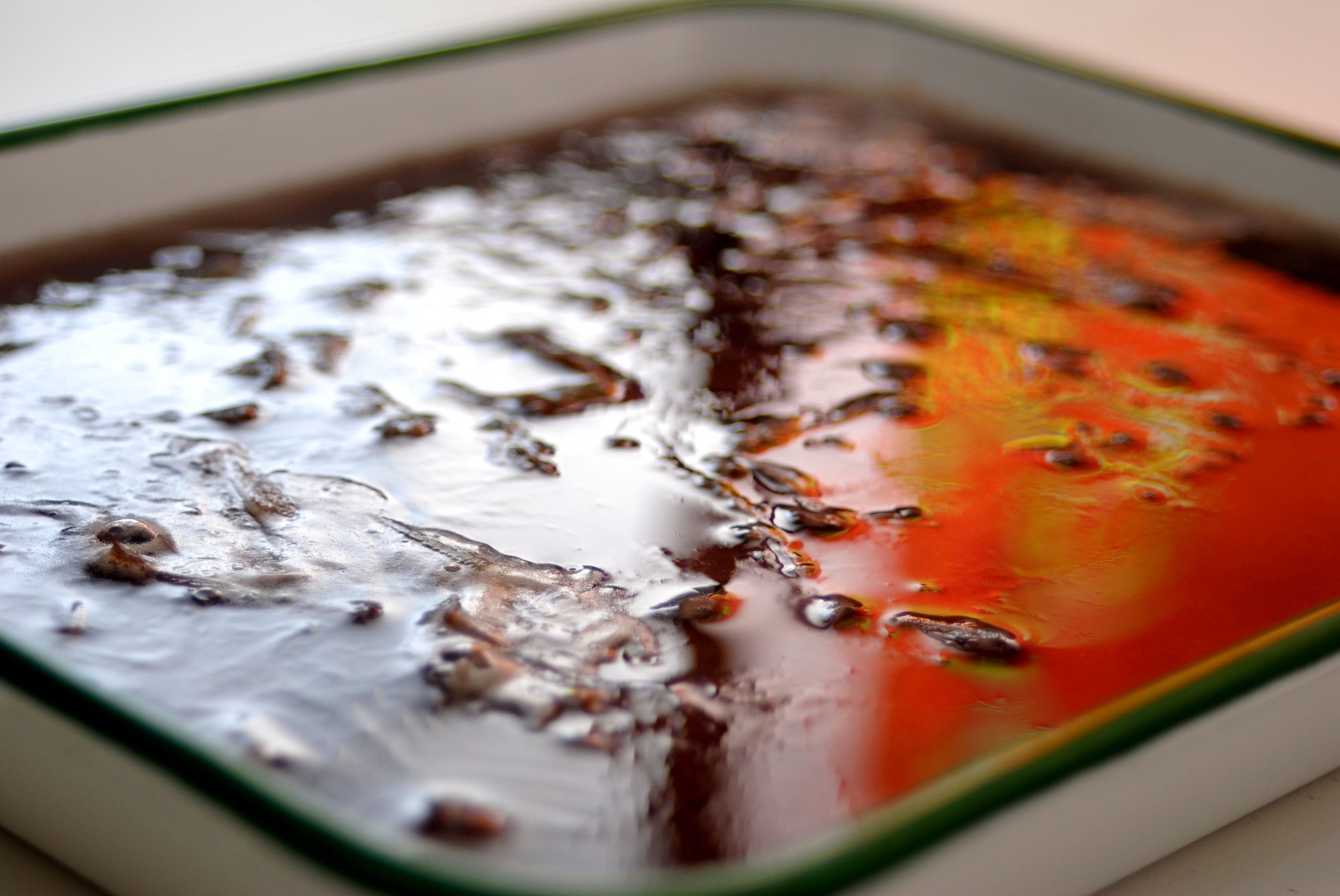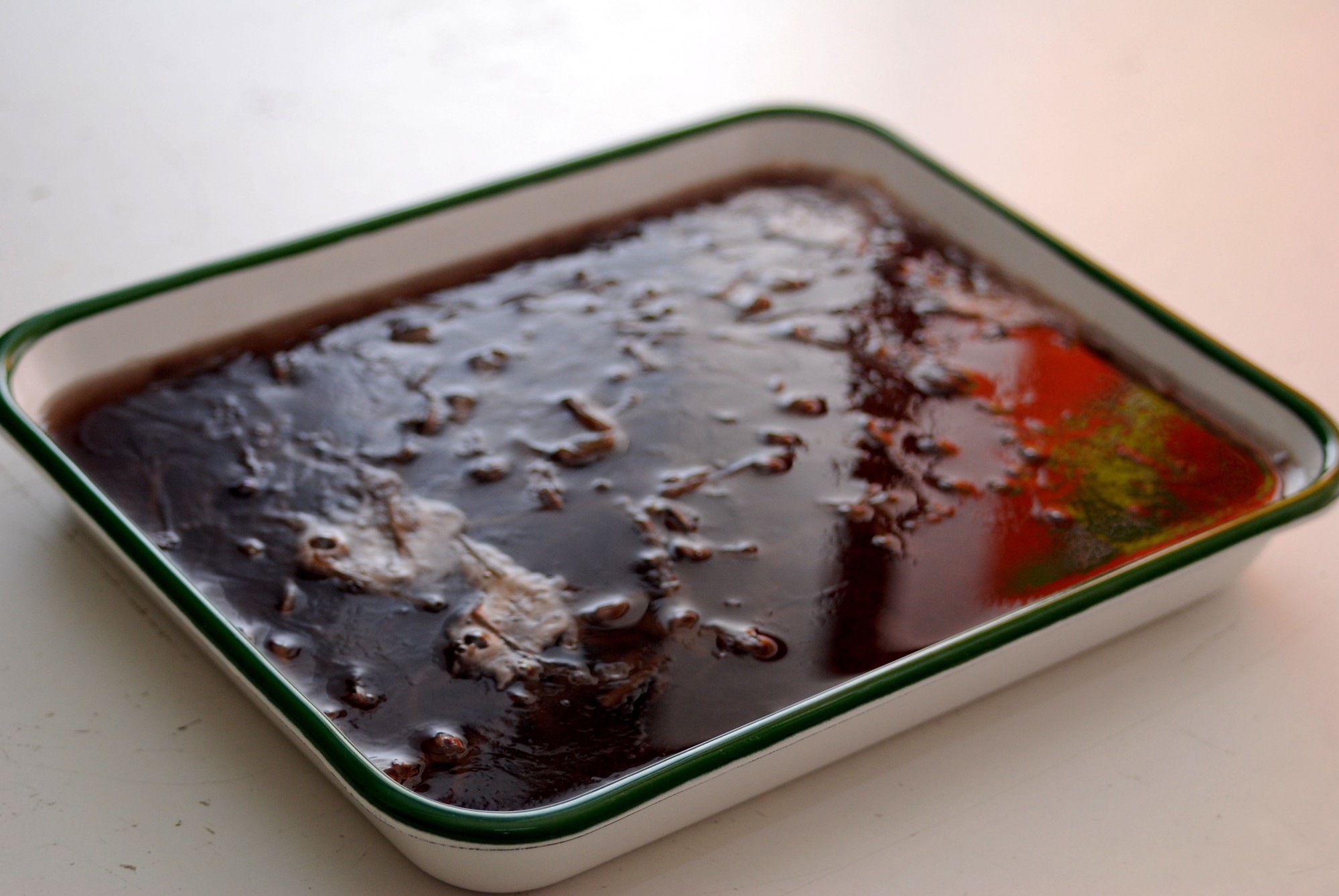 長又を煮汁ごとバット(型)に流し込みます。荒熱がとれたら冷蔵庫へ入れて冷やしましょう。