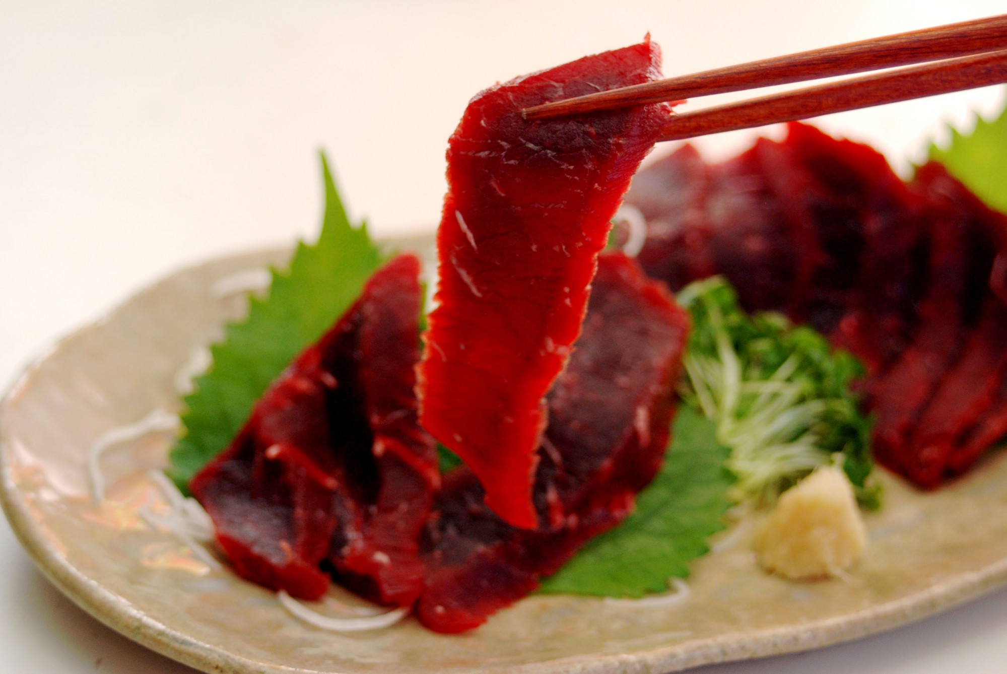 クジラ肉の食感と味は、まさに獣肉と魚肉のあいの子。馬肉のようなさっぱりとした獣肉のような印象もあれば、マグロのようなうま味もあります。目をつむって食べると、本当に馬肉と勘違いしたりマグロ肉だと思ったりする人もいるはず。それだけクセがなく食べやすいお肉なのです。