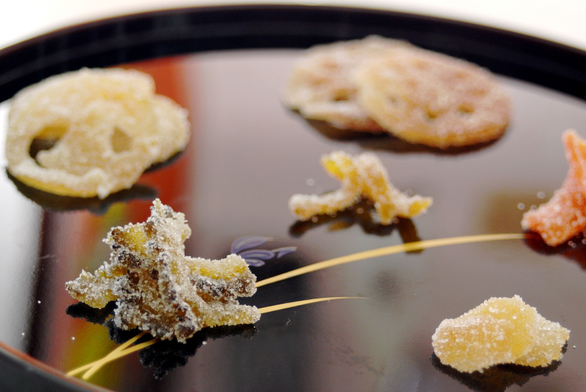 乾燥させて余計な水分を飛ばした材料に、仕上げに砂糖をたっぷりまぶして、てんもんどうの完成です。
