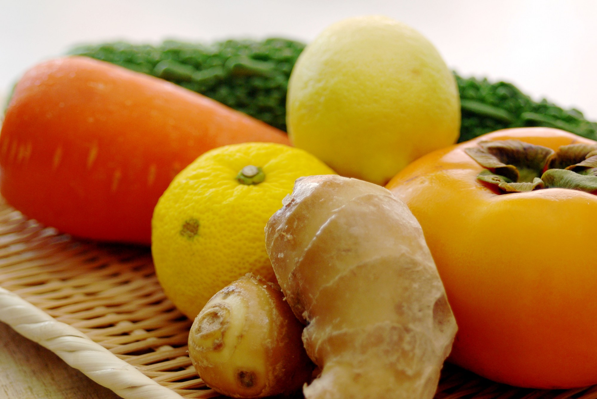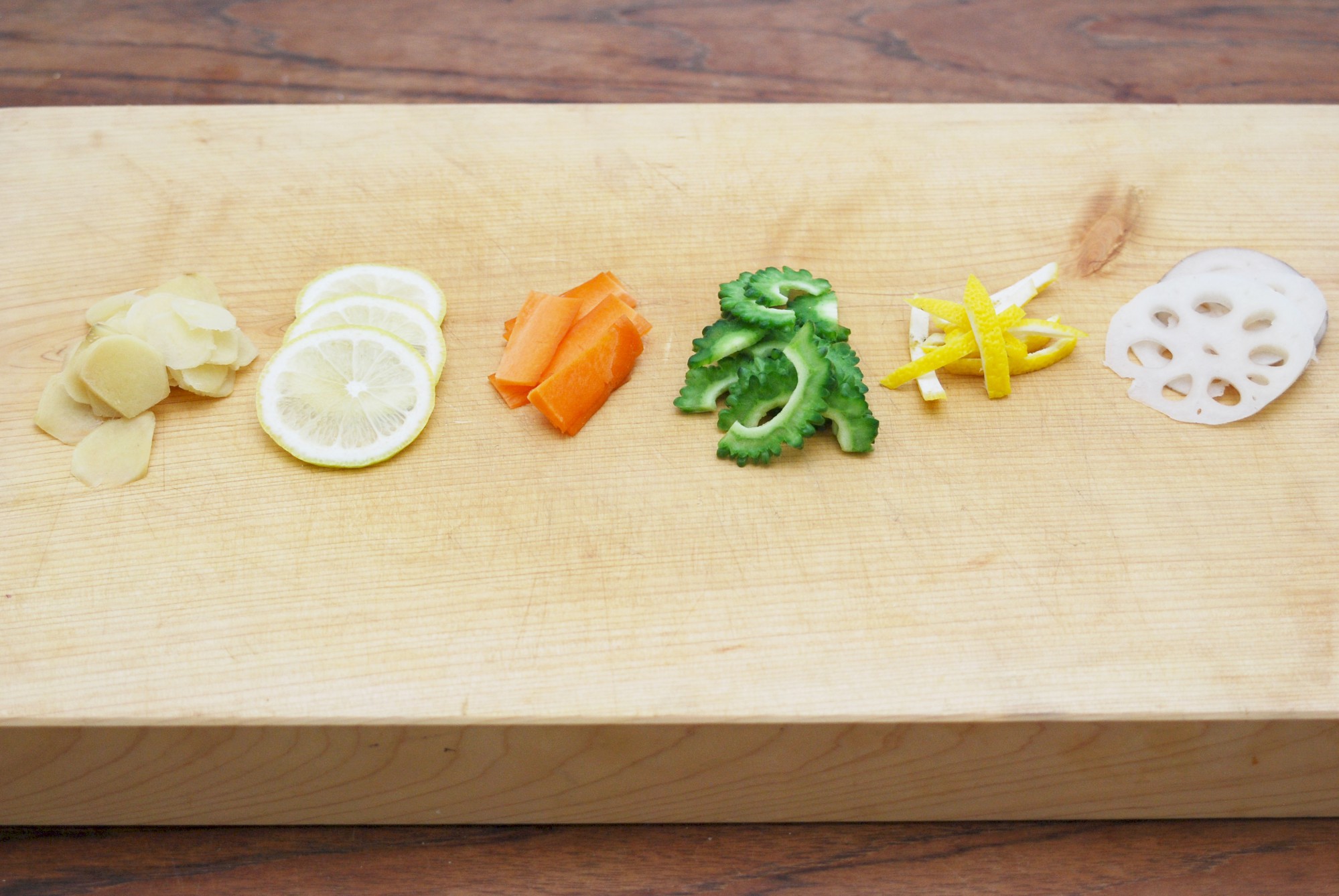しょうがは、繊維に対して直角にスライスすると歯切れがよくなります。また、ゴーヤは種とワタを取り除いてからスライスしましょう。