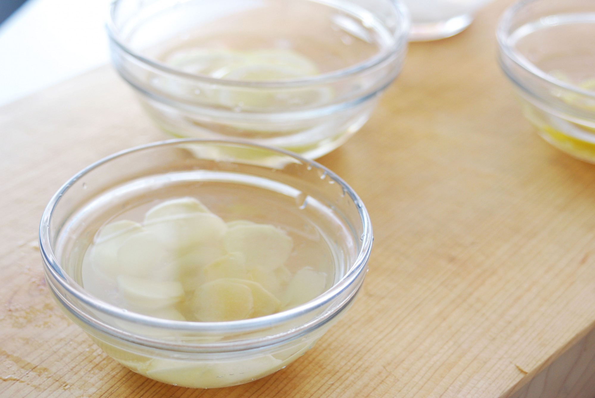 カットした材料を水にさらしてアクを抜きます。特にごぼうやれんこんなどアクの強い野菜には欠かせない下処理です。レモンの皮やゆずの皮などにもアクがあるので、すべての材料をアク抜きしましょう。