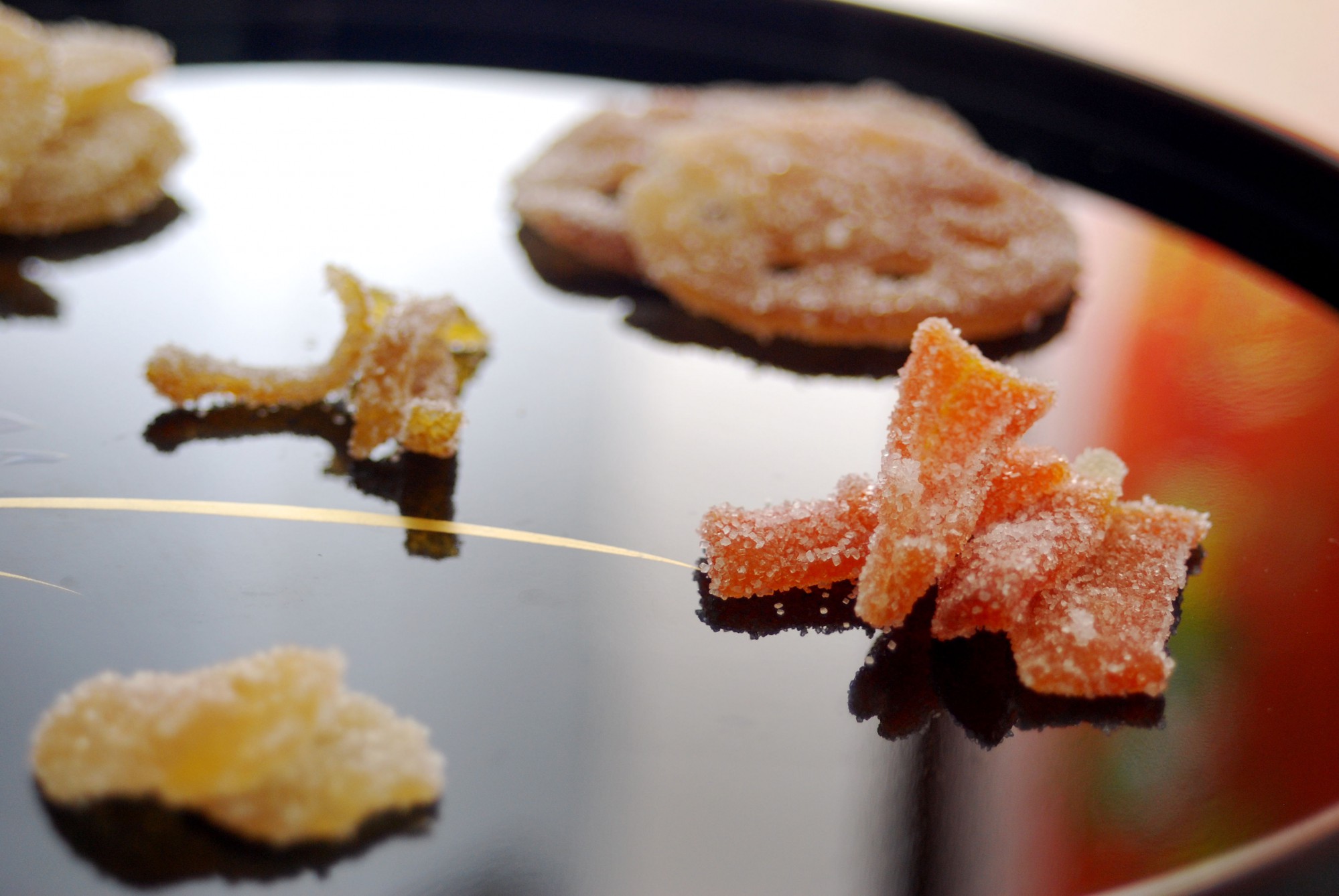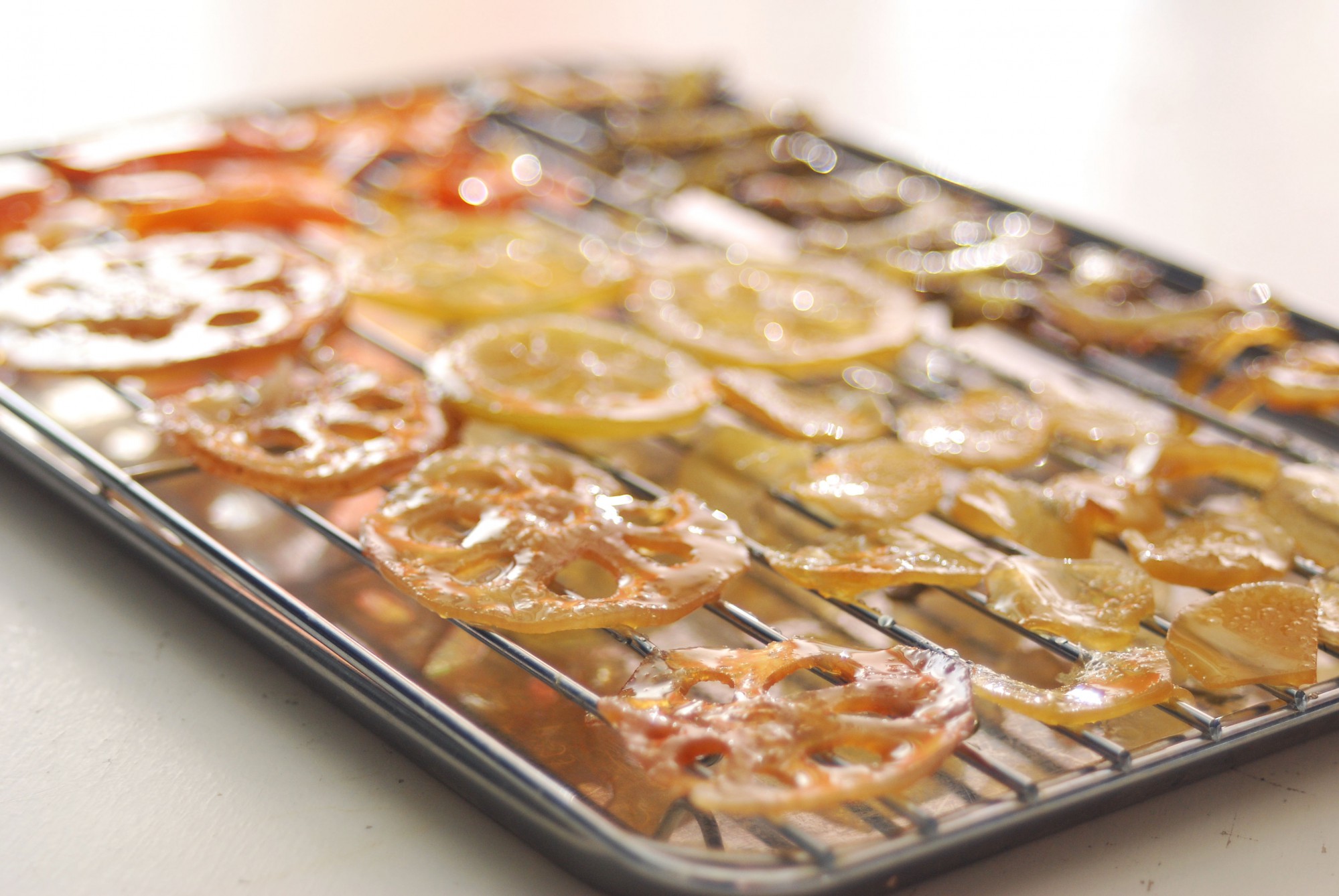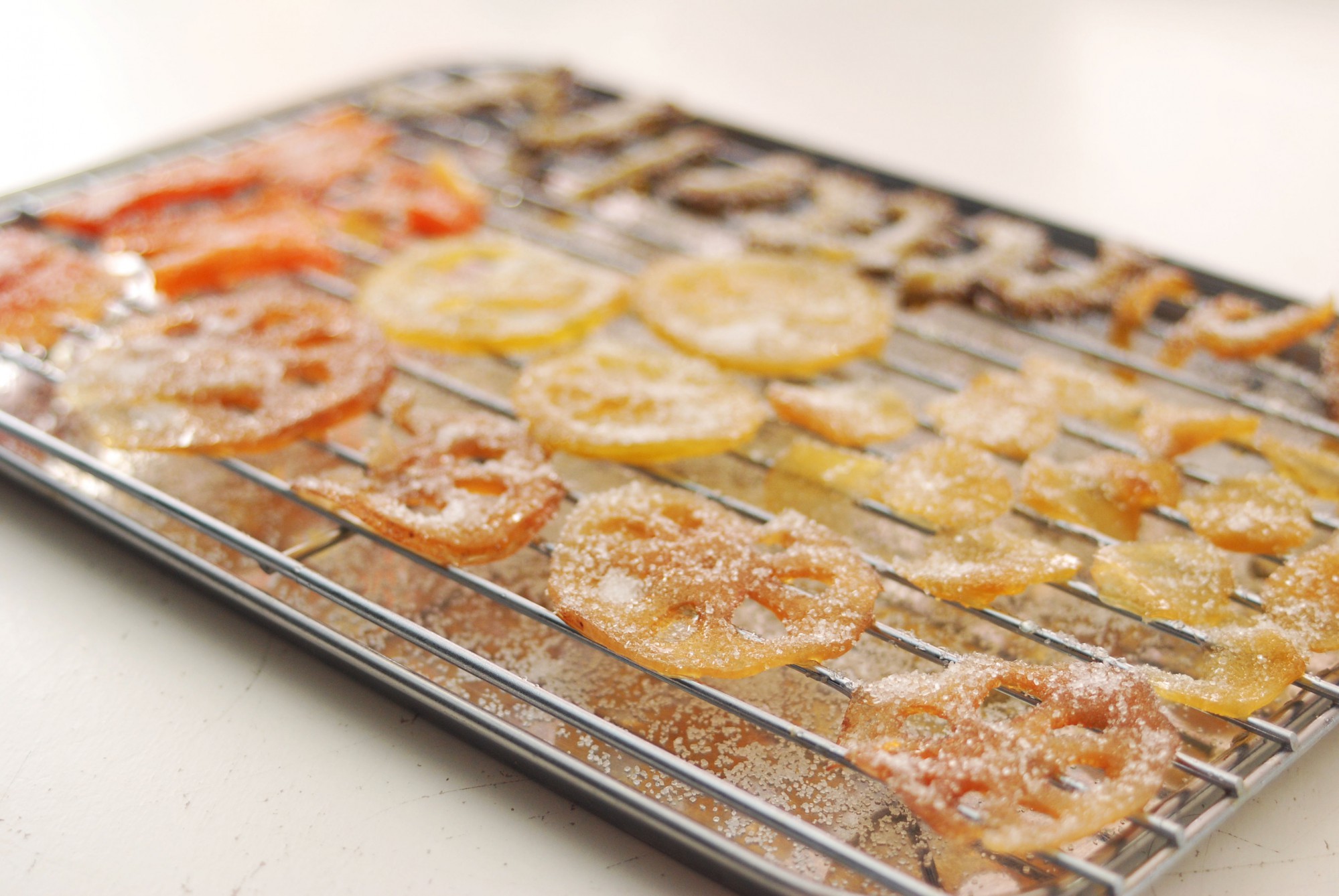 十分に冷めたら材料をザルなどにあげ、水気を飛ばします。ラップなどをせず冷蔵庫内に置いておくと効率的に乾かせます。砂糖で煮た材料は、乾かしてもパリパリにならずしっとりしているのが特徴です。