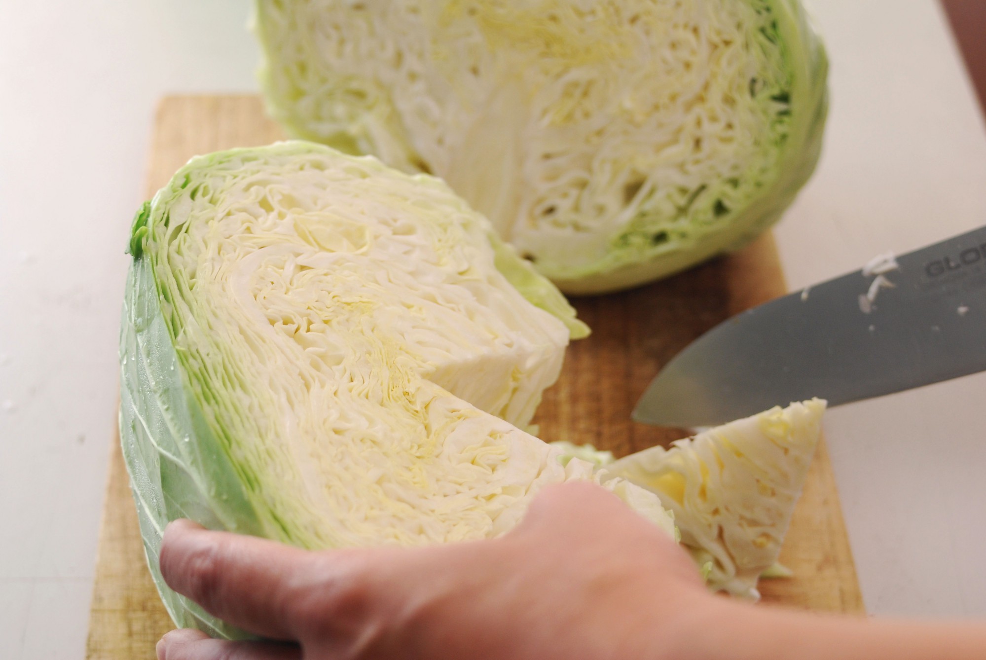 まずはキャベツを半分に割り、芯を取り除きます。このときに取り外した外側の葉は、後から使うので捨てずにとっておきましょう。