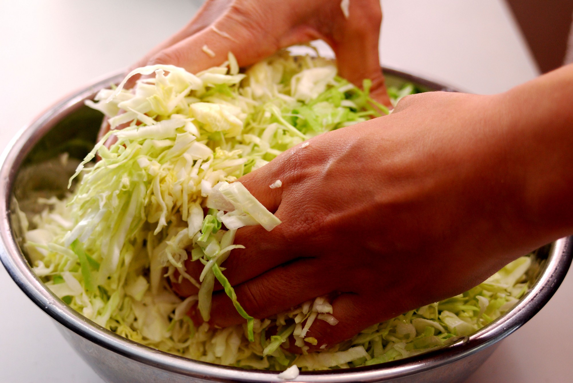 作業内容は、刻んだキャベツを塩漬けにして保存性を高め、乳酸発酵がうまくいくようお手伝いしてあげるだけ。
