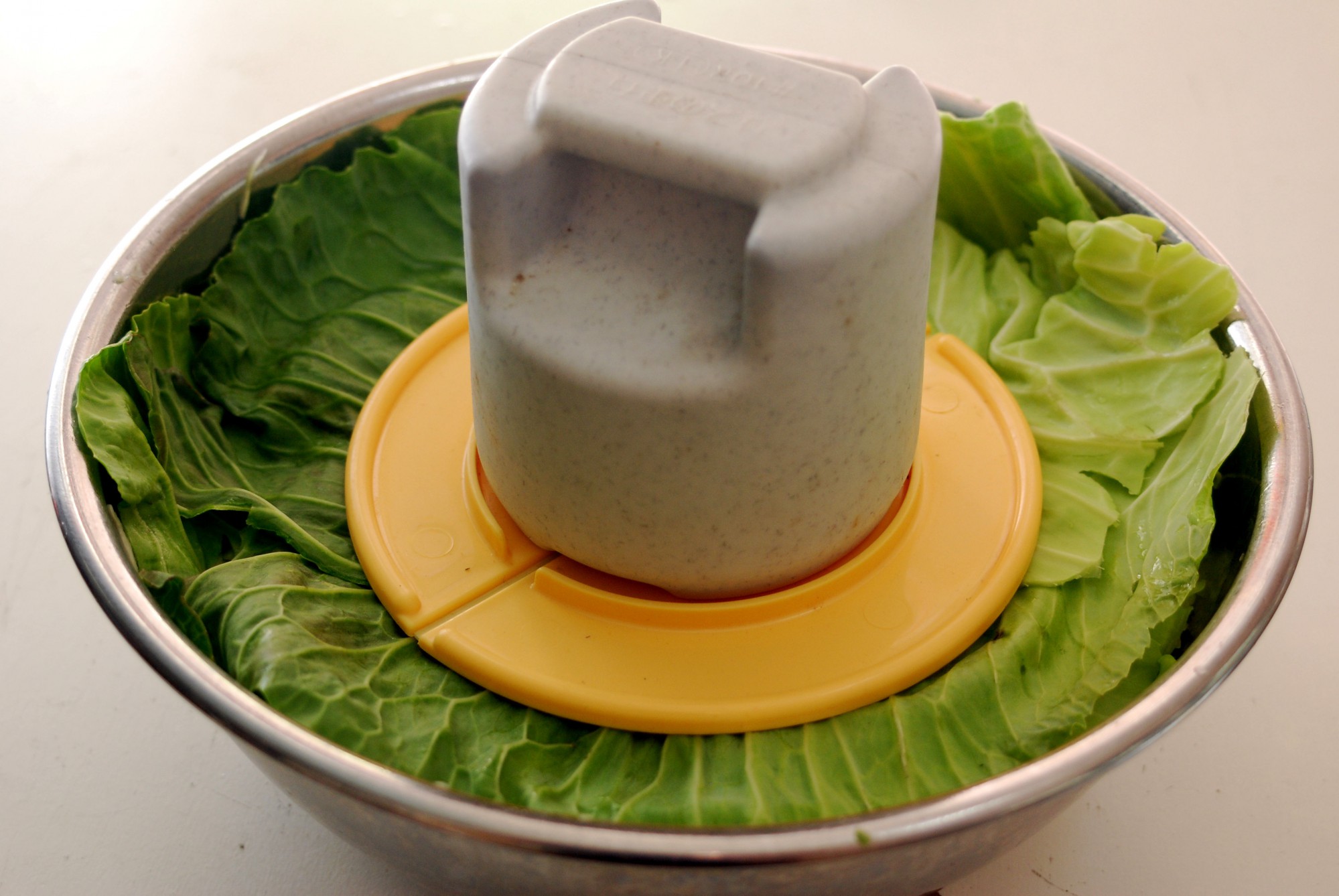 最初に外したキャベツの外側の葉をフタに使い、キャベツを塩漬けにします。漬け物石をキャベツに置き、常温で2~7日ほど置いておきましょう。1日に1回混ぜると、乳酸菌がうまく発酵しやすいです。