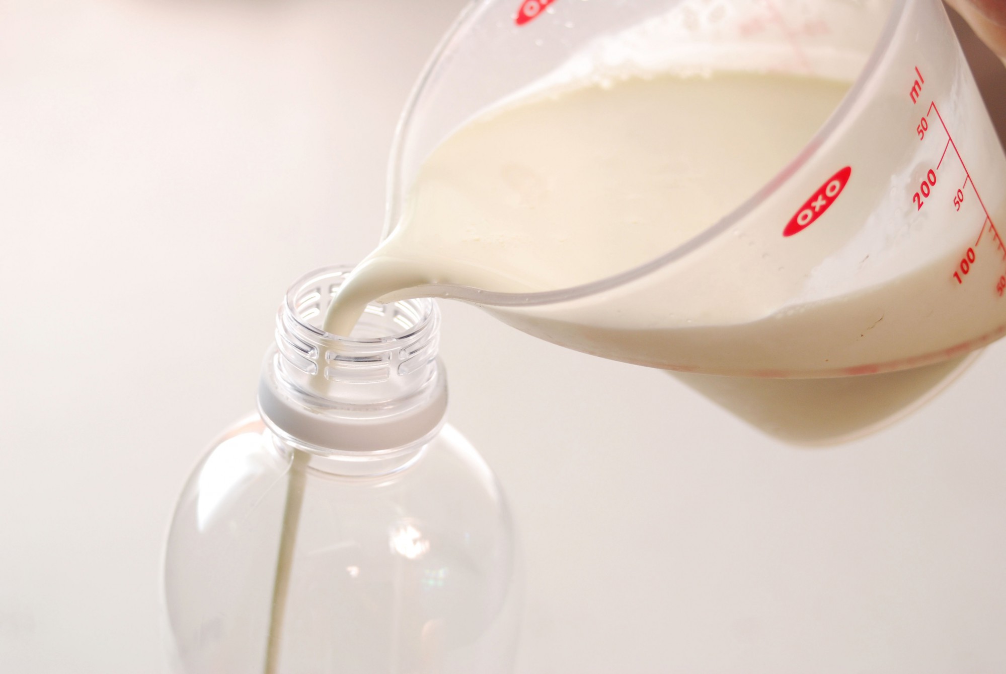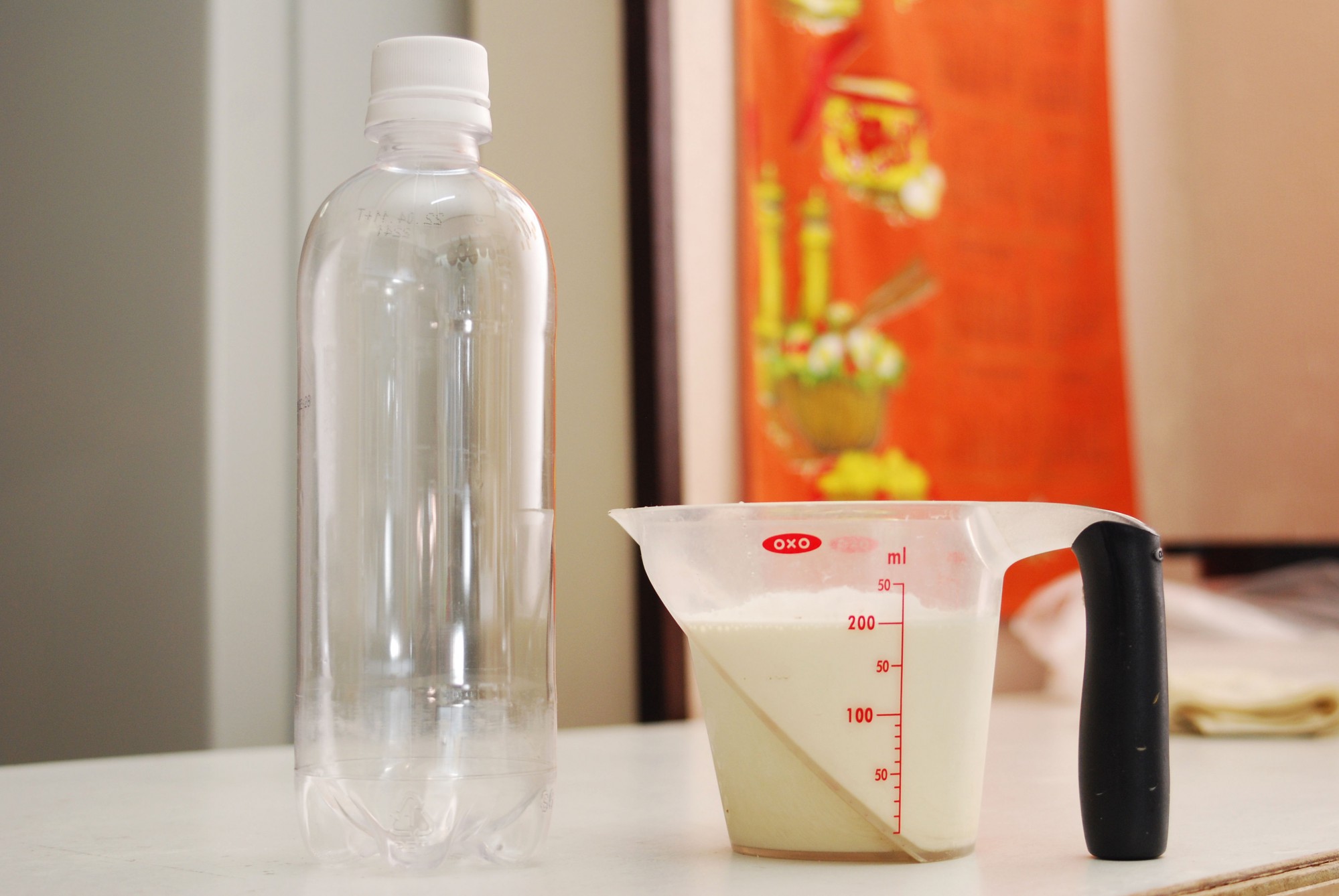 今回使うのは写真の通り、200mlの生乳と350ml容量のペットボトルです。ペットボトルは、使用する生乳の量よりも余裕のあるサイズを選ぶのがポイント。