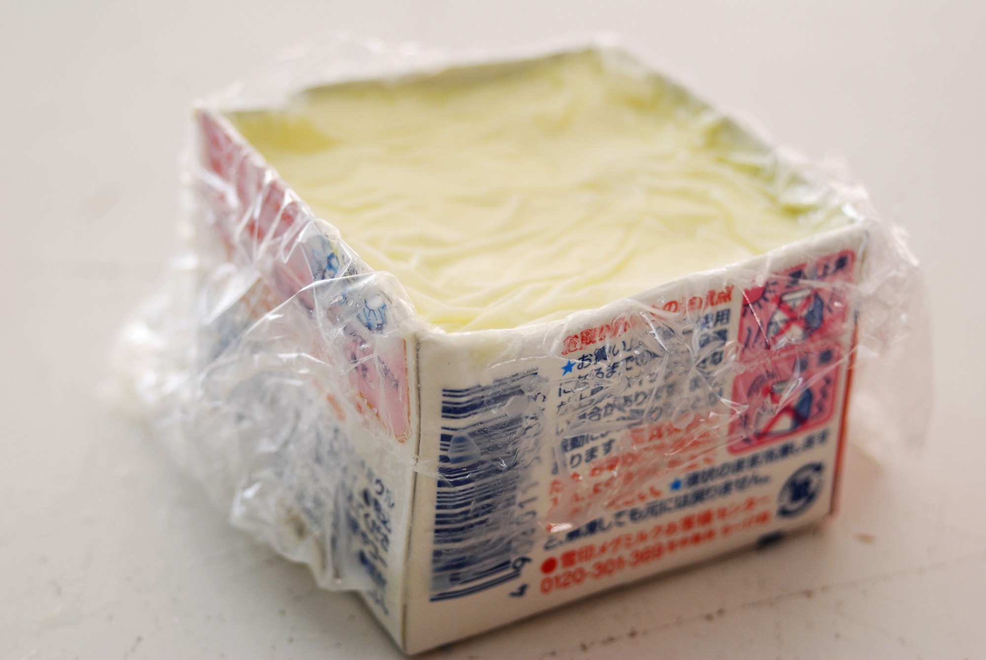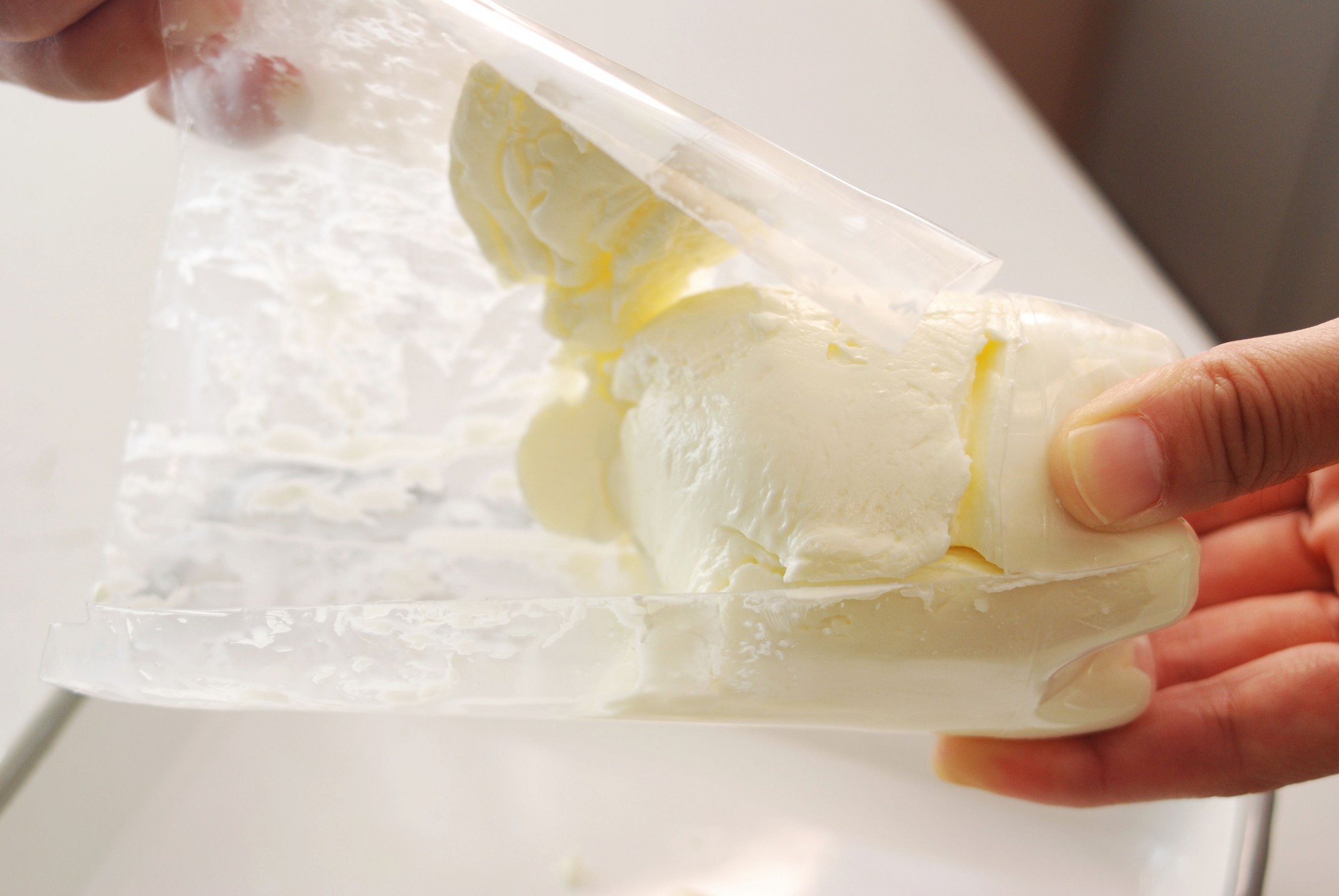 生乳が入っていたパックを洗って乾かせば、バターを成型するのに便利です。作ったバターをパックに詰め込んで冷蔵庫で冷やせば、きれいに成型できます。バターが冷えたらハサミでパックを切って取り出し、バター用の保存容器などに移してください。
