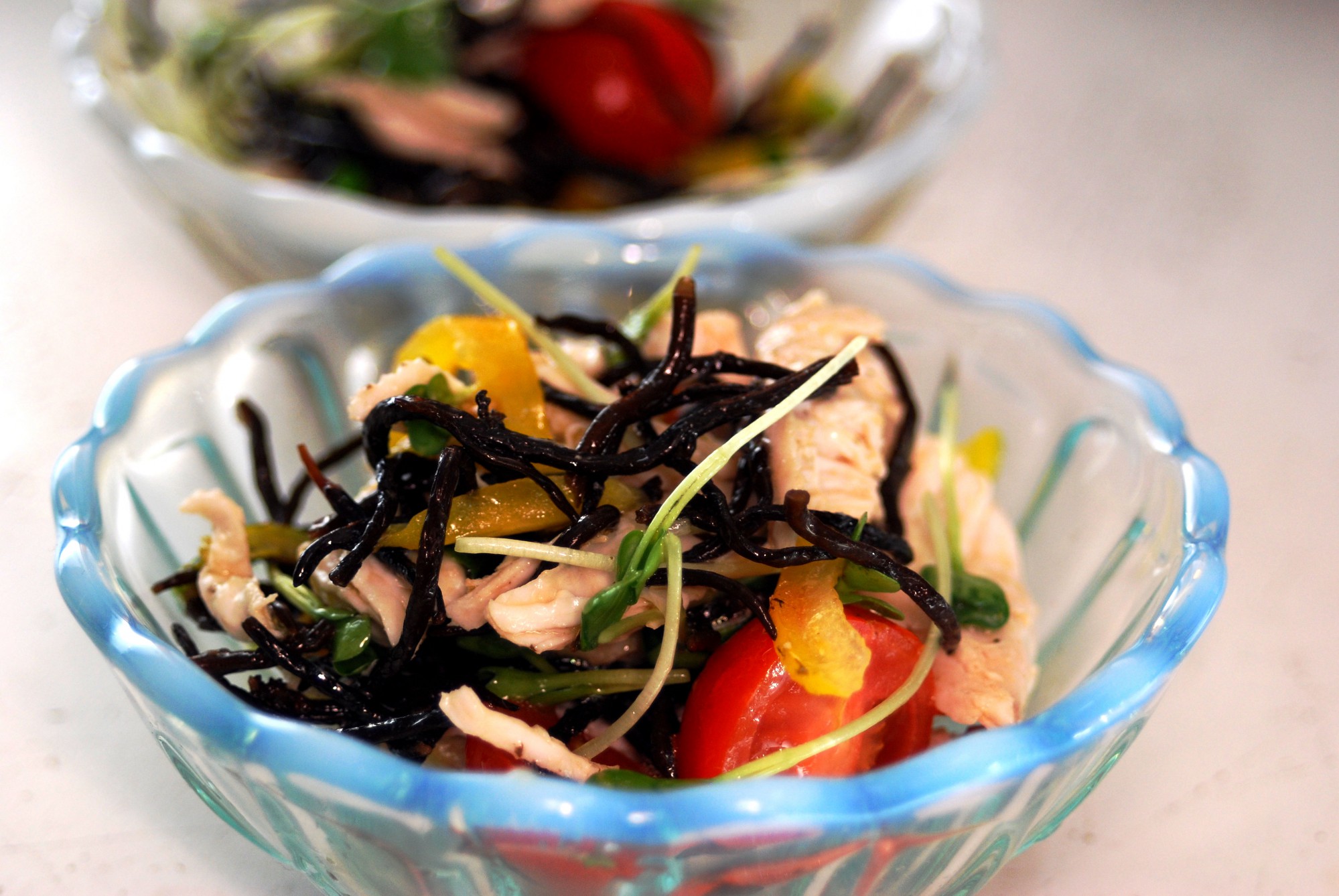 - 水気を切ったひじきとほぐしたササミ、カットしたミニトマト、スライスしたパプリカをボウルに入れ、塩、オリーブオイル、白ワインビネガー、しょうゆを加えてよくあえる。