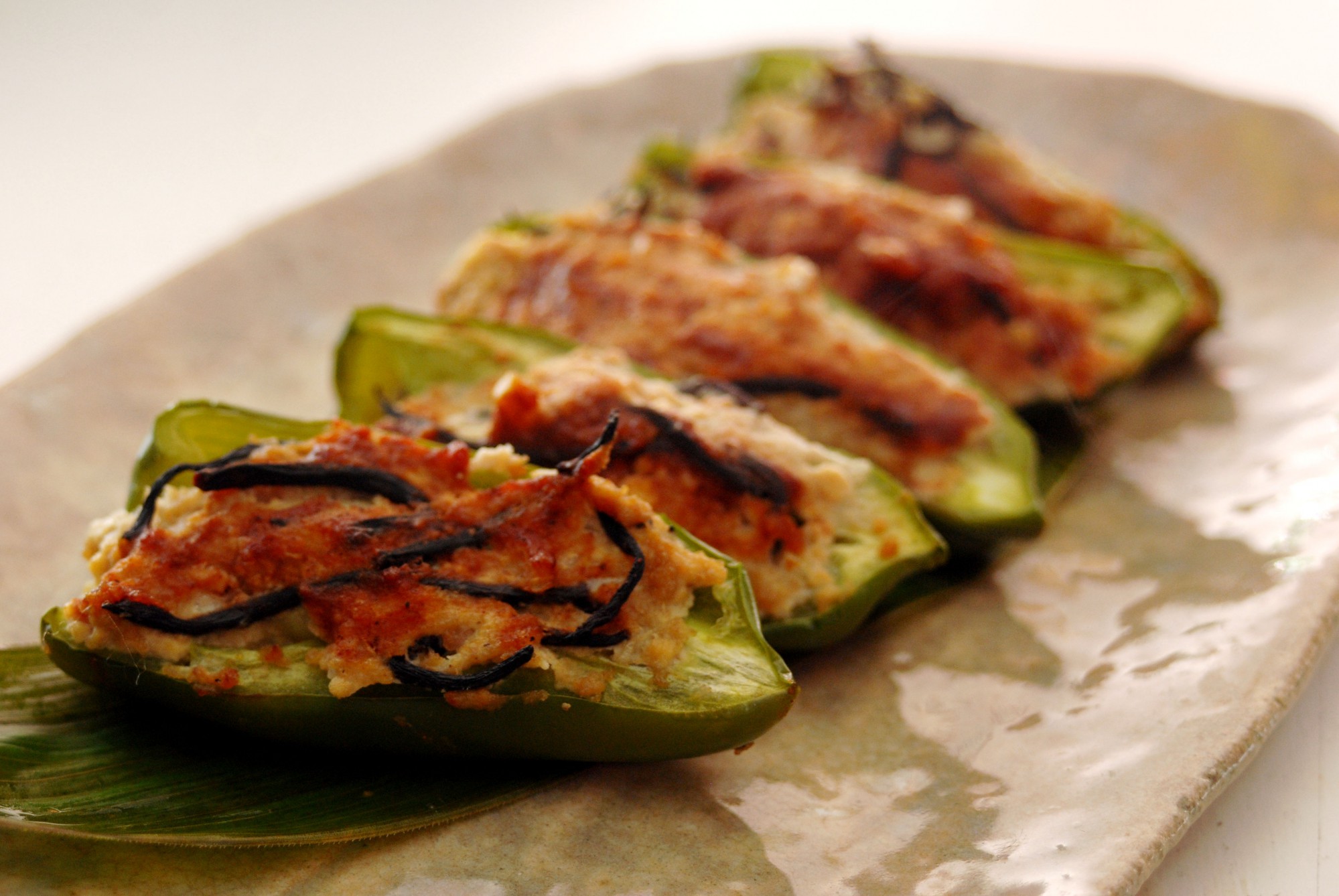 - ヘタを取り半分にカットしたピーマンに5をつめる。