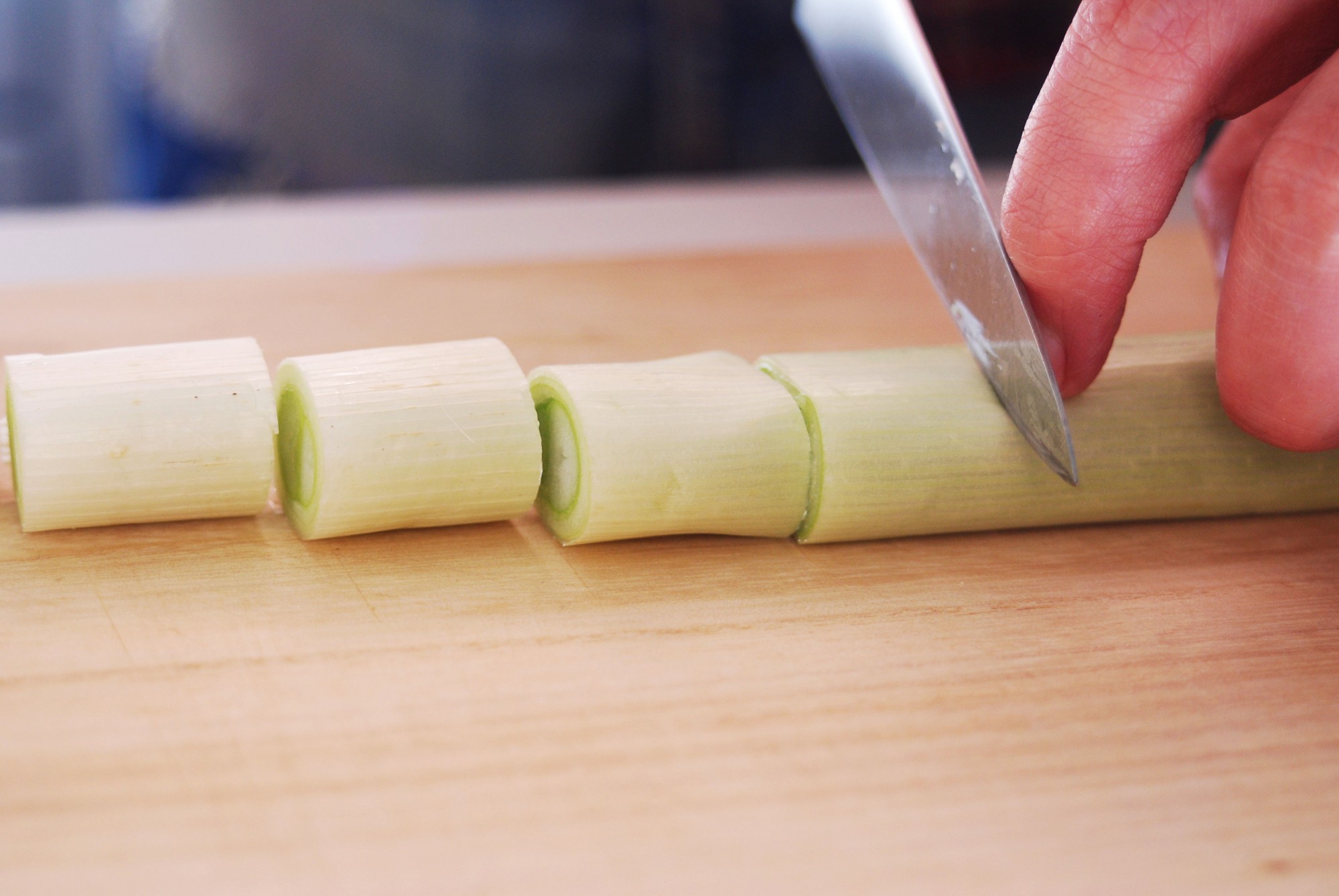 長ねぎを2cm幅にカットします。長ネギの青い部分はからいので、青い部分以外を使いましょう。