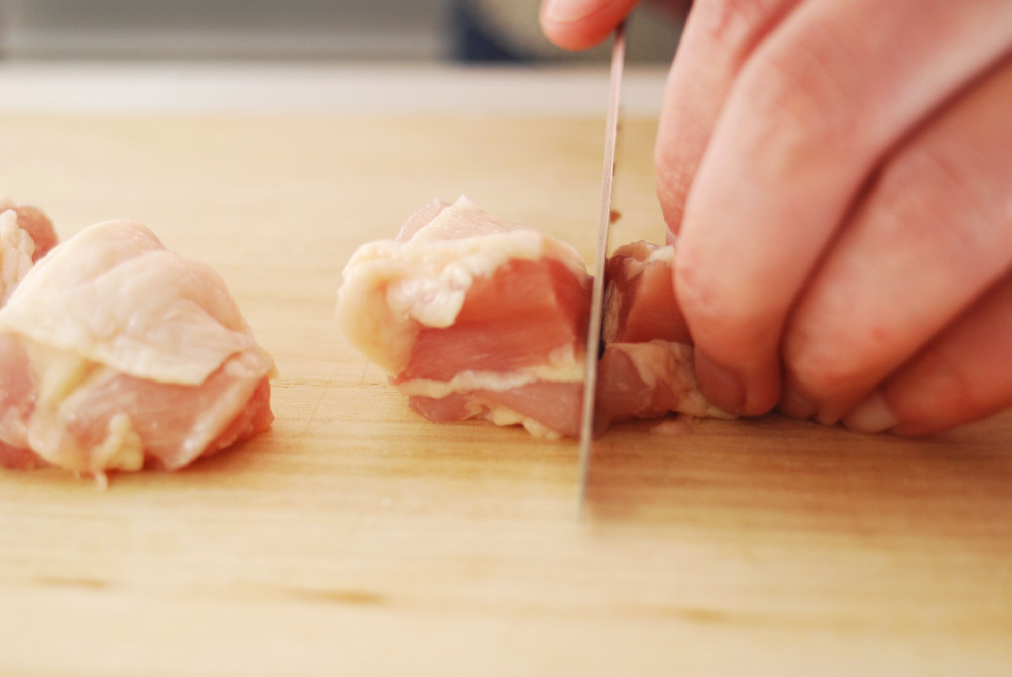 次に鶏もも肉をカットします。すべて同じ大きさにそろえる必要はありません。多少のばらつきがあった方が使いやすいので、一口大を目安にざくっと切り分けましょう。