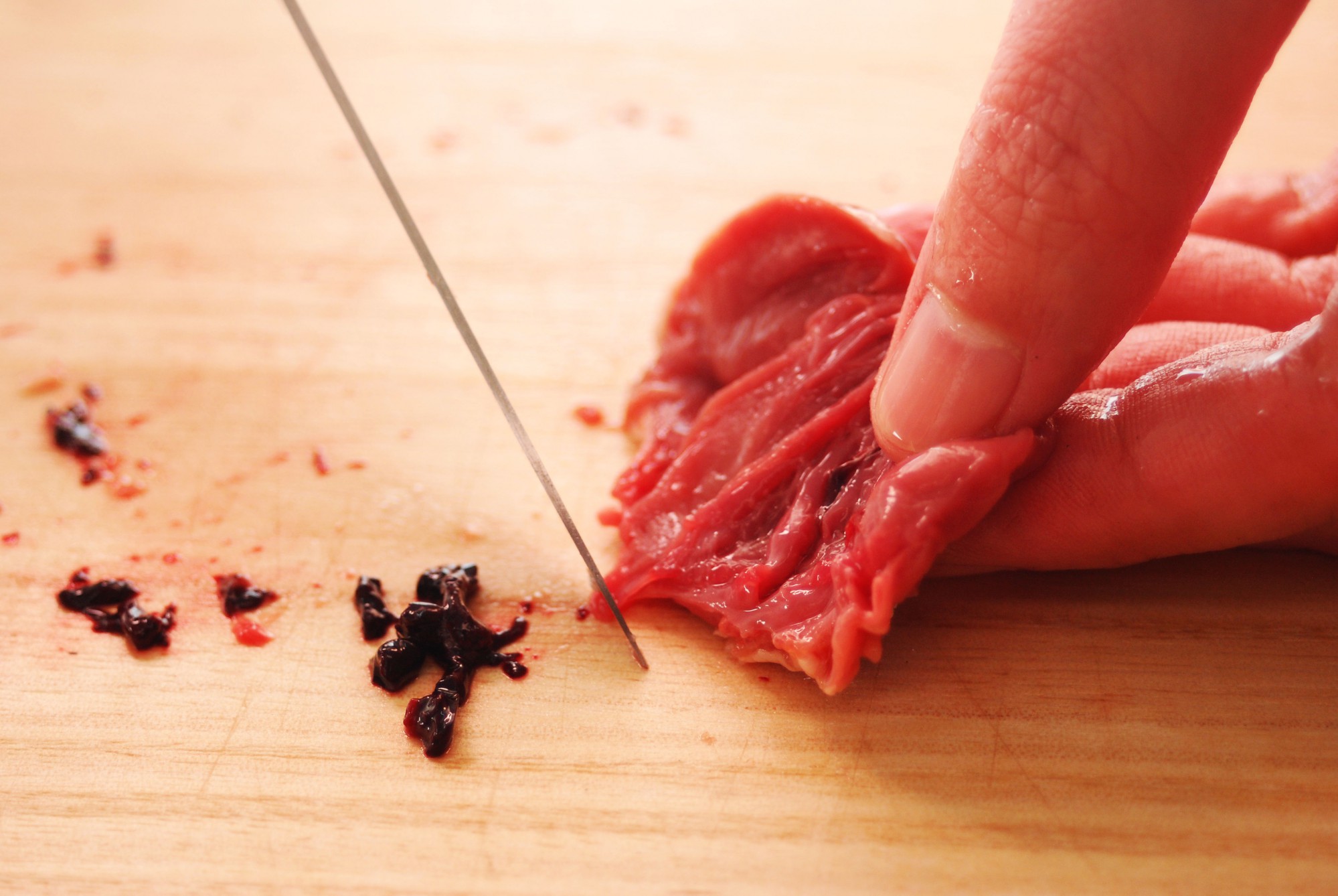 ハツは包丁で切り開き、中にたまっている血をしごき出します。やや手間のかかる作業ですが、これを行うと行わないとでは味に大きな差が出るので、おいしい焼き鳥を食べるためにはこの手間を惜しまずしっかり処理しましょう。