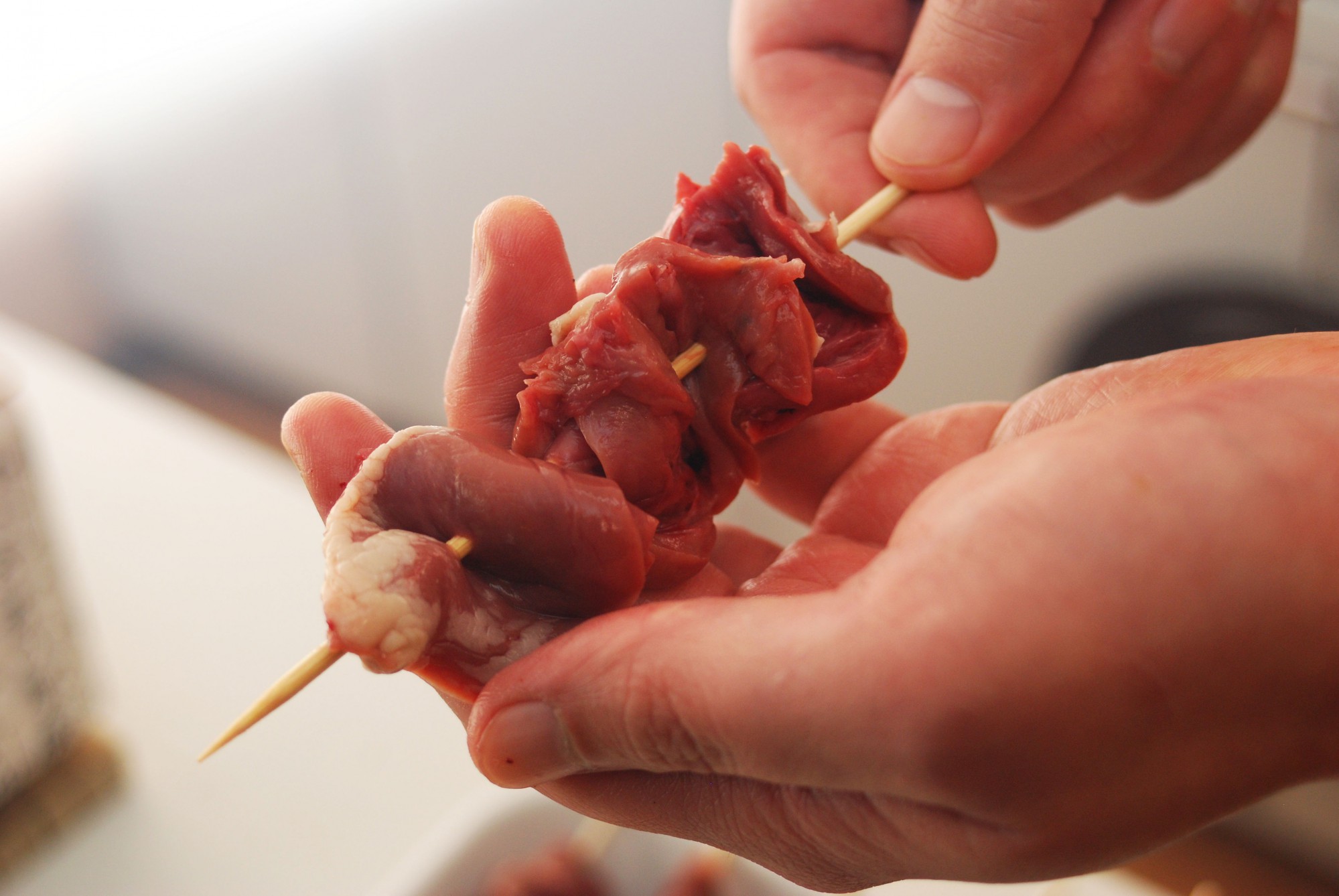 ハツとレバー、それぞれ血の処理を終えたら串に刺していきましょう。