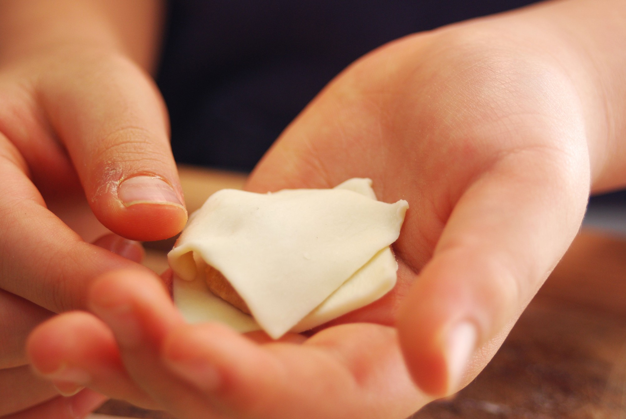 成形の仕方は簡単。伸ばした生地を適当な大きさにカットし、ピーナッツ餡を挟むだけ。小さなお子さんでもできる作業です。きちんと挟めなくても大丈夫。餡がはみ出てしまっても、生地がずれてしまっても、それはそれで個性的な仕上がりになります。
