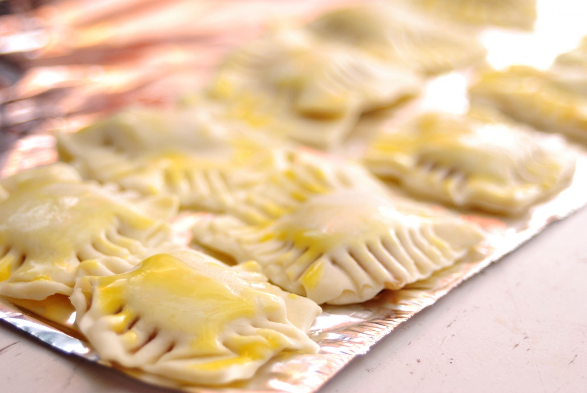 餡を挟んだパイ生地は、表面に卵黄を塗っておくときれいな焼き色がつきます。ついでに、フォークの背を使って模様もつけておきましょう。