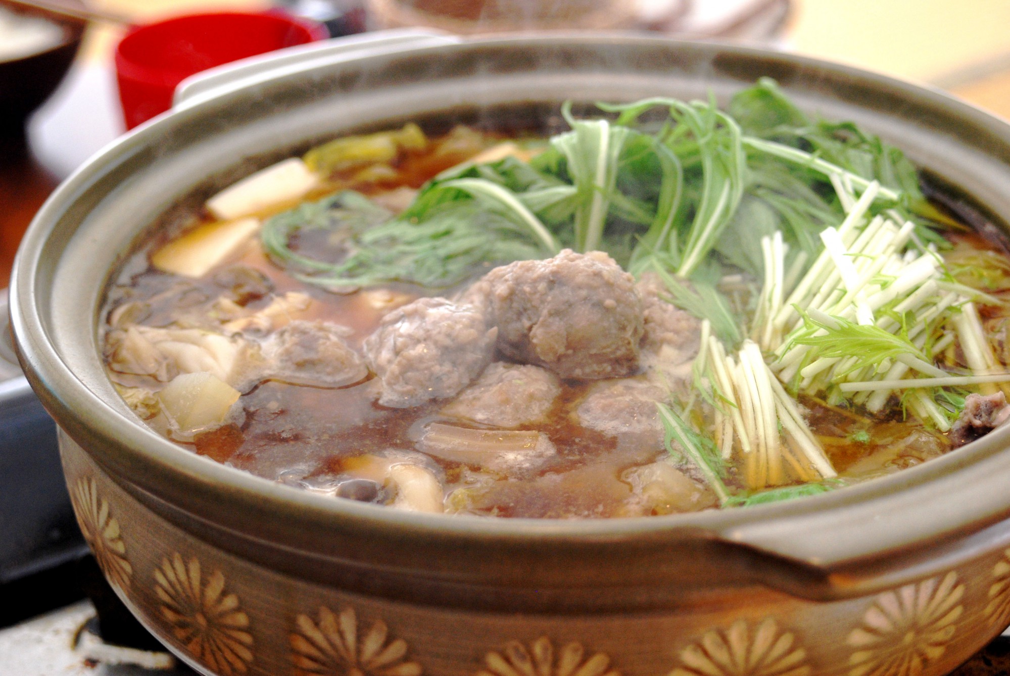 すべてのタネを団子にして鍋に入れたら、フタをして引き続き弱火で煮込みましょう。10分程度が目安です。団子に火が通り、にんじんと大根が軟らかくなったら水菜を加え、しょうゆで味を調えて完成!