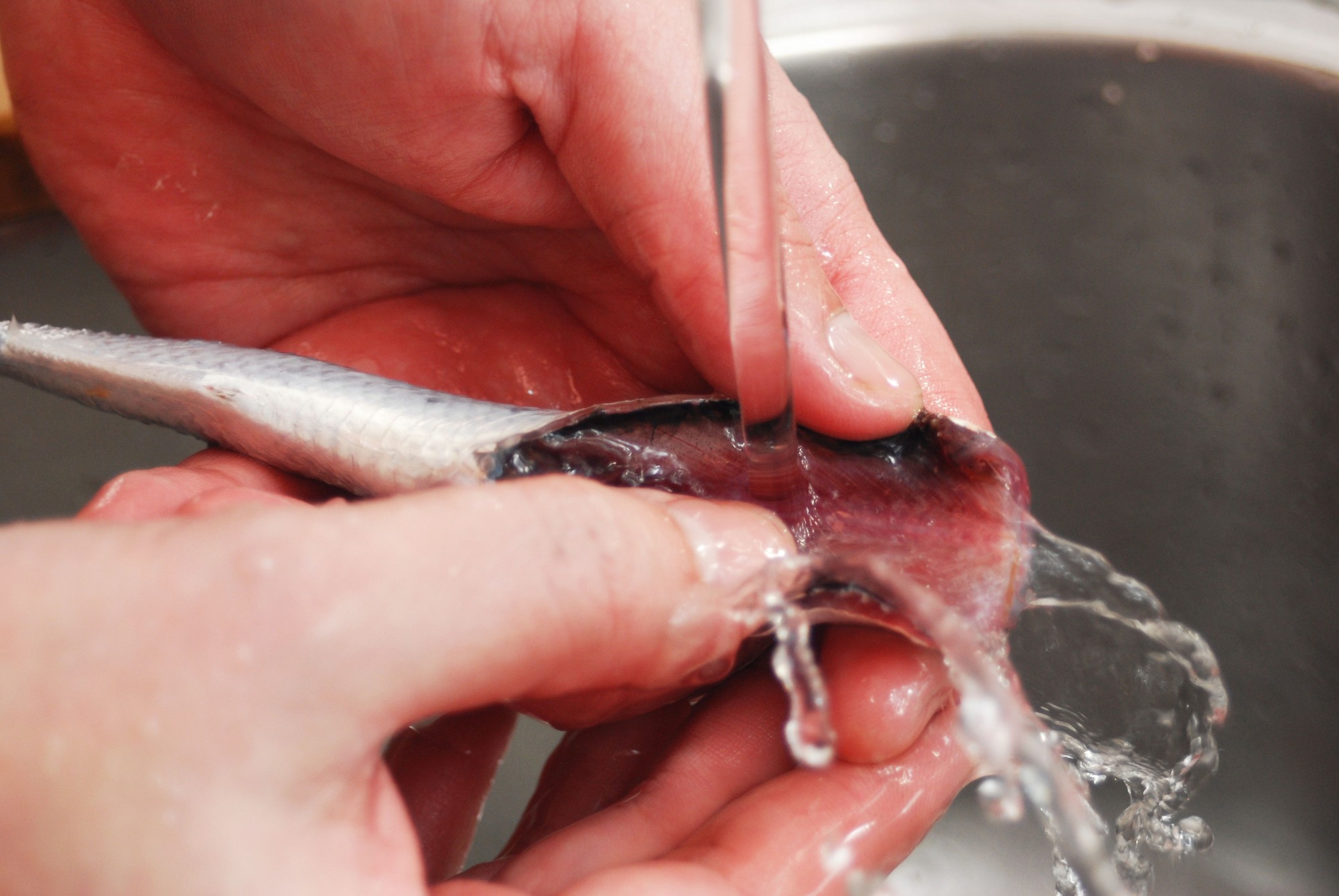 いわしの頭を落としてお腹を開いたら、内臓を取り出して水でよく洗いましょう。内臓や血などは食べても問題ありませんが、残っていると生臭さの原因になります。